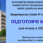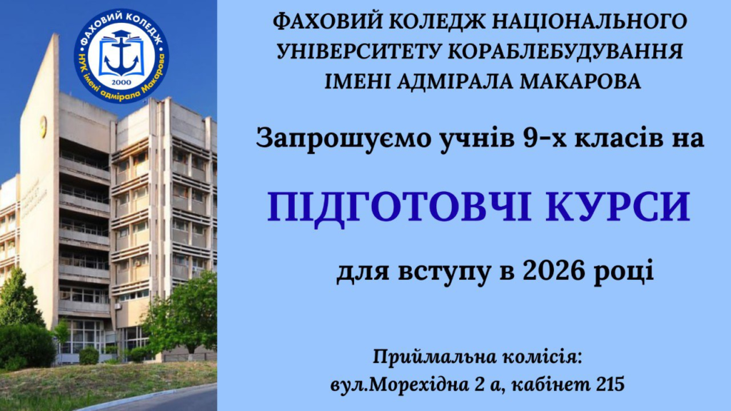 Фаховий коледж Національного університету кораблебудування імені адмірала Макарова оголошує набір слухачів на 3-місячні підготовчі курси для майбутніх вступників 2026 року. 👩🎓 Кому буде корисно? Учням 9-х класів, які планують вступ до коледжу та прагнуть: Навчальні дисципліни: Чому варто Детальніше