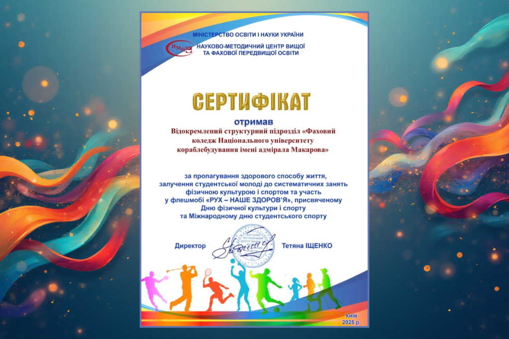 З радістю повідомляємо, що студенти ВСП «Фаховий коледж Національного університету кораблебудування імені адмірала Макарова» був відзначений Сертифікатом від Науково-методичного центру вищої та фахової передвищої освіти! Ми пишаємося нашими студентами, які активно долучилися до цієї ініціативи, продемонструвавши свою енергію, спортивний дух Детальніше