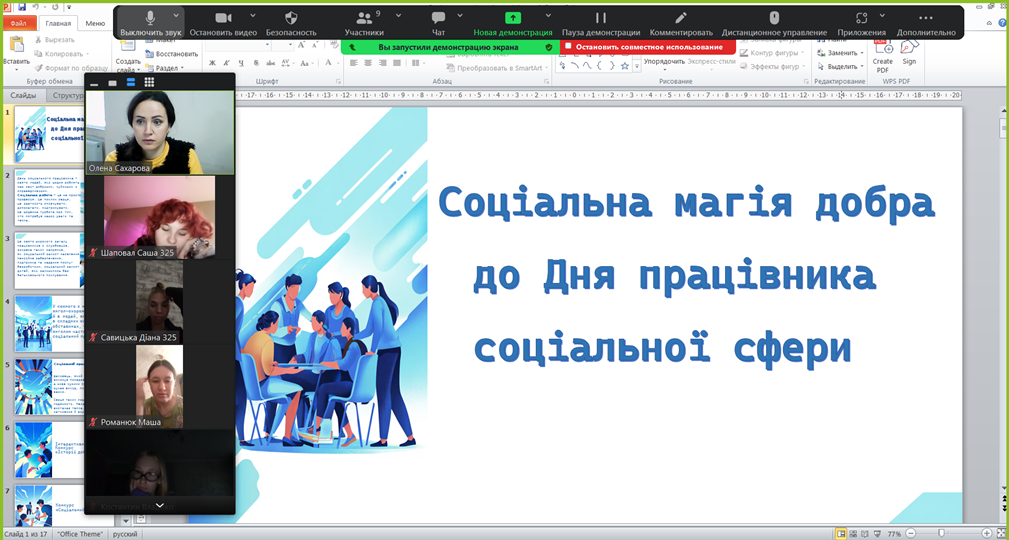 До Дня працівника соціальної сфери, яке цьогоріч відзначалося 2 листопада, Сахаровою О.М. для здобувачів освіти ІІІ курсу спеціальності 231 Соціальна робота було проведено позаурочний захід «Соціальна магія добра», присвячений людям, які щодня дарують турботу, підтримку та віру тим, хто цього Детальніше