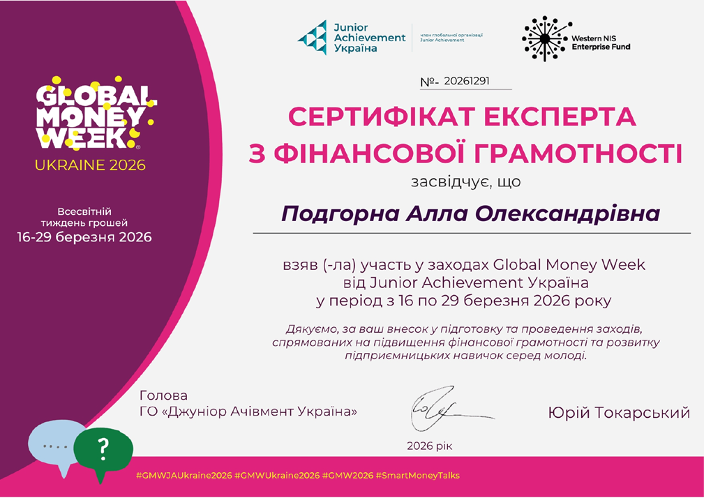 Наш коледж активно долучається до міжнародних ініціатив, що сприяють розвитку фінансово-економічної культури молоді. Саме тому викладачка нашого коледжу, Подгорна Алла Олександрівна, активно долучається до міжнародних ініціатив, що сприяють розвитку фінансово-економічної культури молоді і нещодавно отримала Сертифікат експерта з фінансової грамотності Детальніше