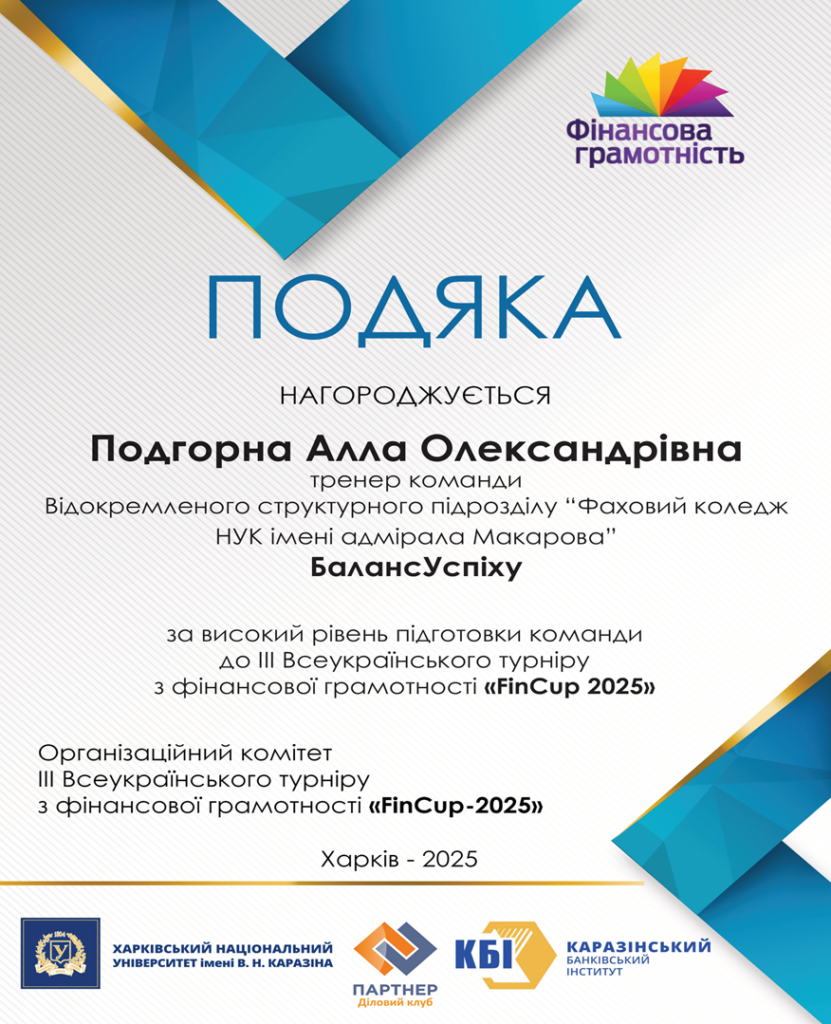Щиро вітаємо команду нашого коледжу з гідною участю у ІІІ Відкритому Всеукраїнському турнірі з фінансової грамотності «FinCup-2025»! Турнір організовано Харківським національним університетом імені В. Н. Каразіна.