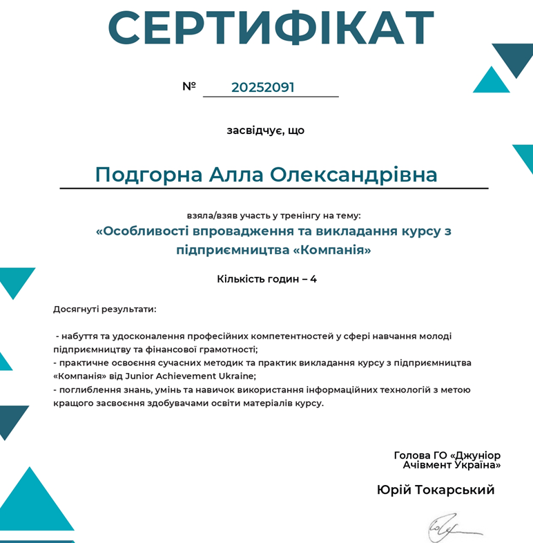 Викладач фінансово-економічних дисциплін коледжу Алла Олександрівна Подгорна долучилася до впровадження програми з підприємництва «Компанія».