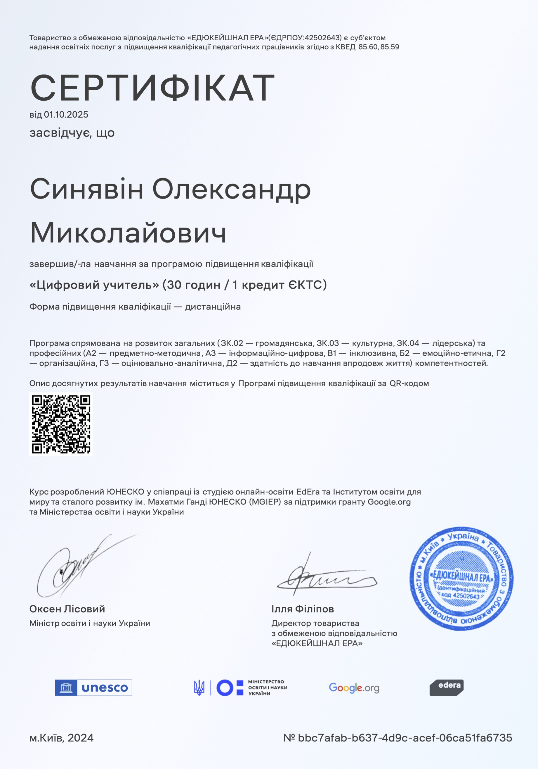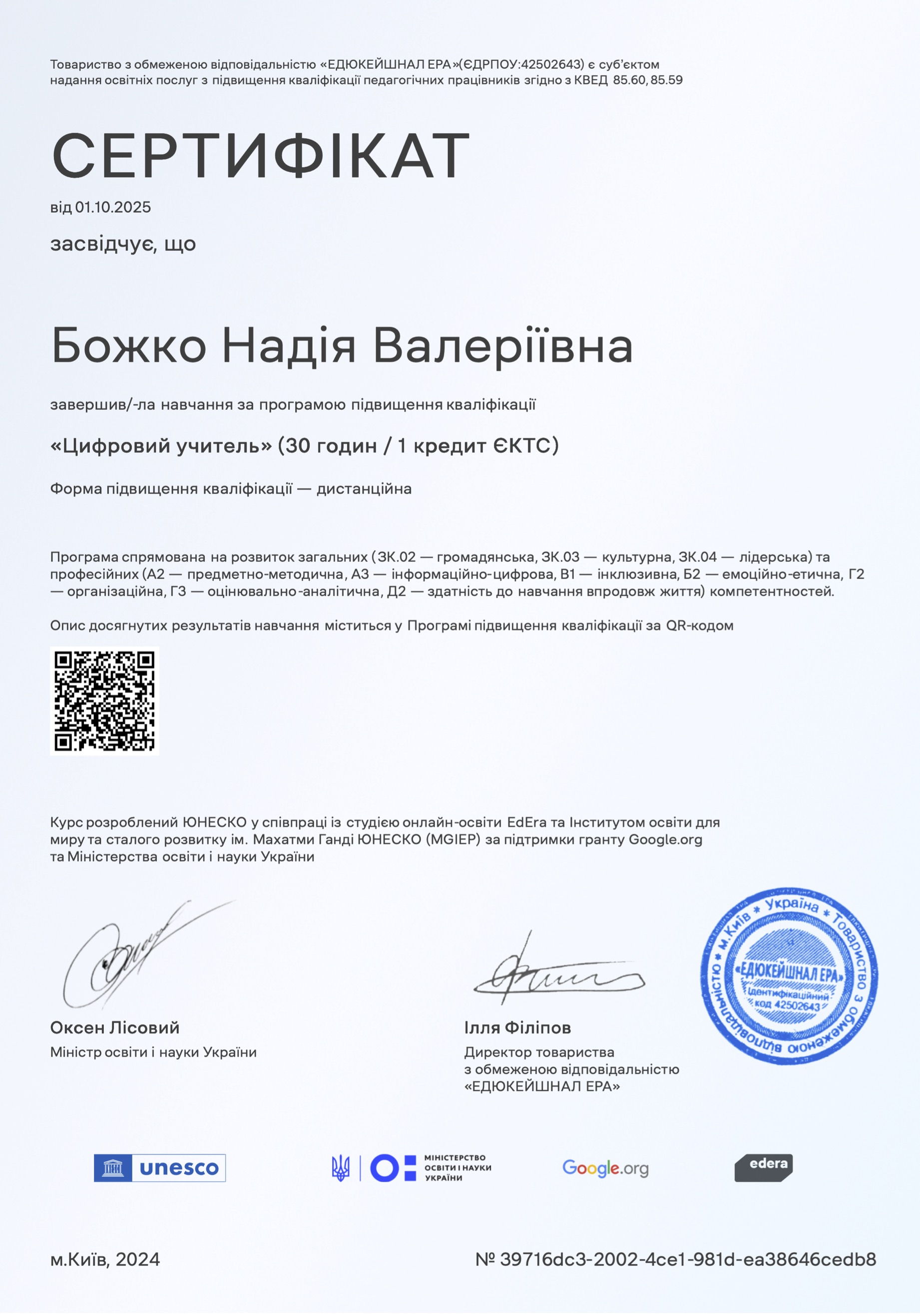 Щиро вітаємо колег із успішним підвищенням кваліфікації та набуттям нових знань, що сприятимуть ефективному впровадженню цифрових інструментів у навчальний процес і розвитку сучасного освітнього середовища.
