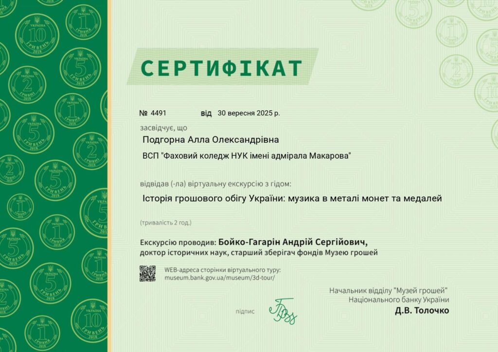 30 вересня 2025 року викладачка фінансово-економічних дисциплін нашого коледжу А. О. Подгорна долучилася до пізнавального вебінару «Історія грошового обігу України: музика в металі монет та медалей», організованого Національним банком України та Музеєм грошей НБУ.