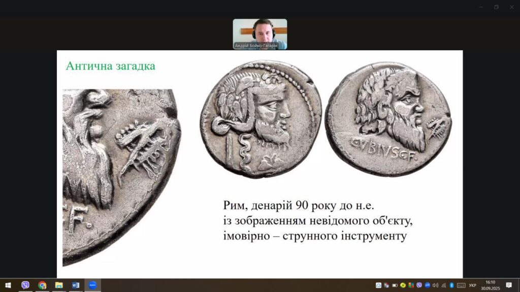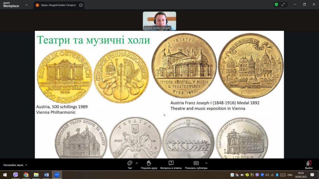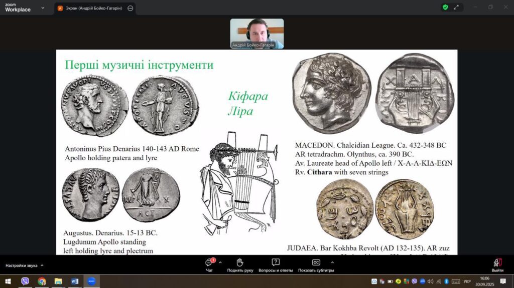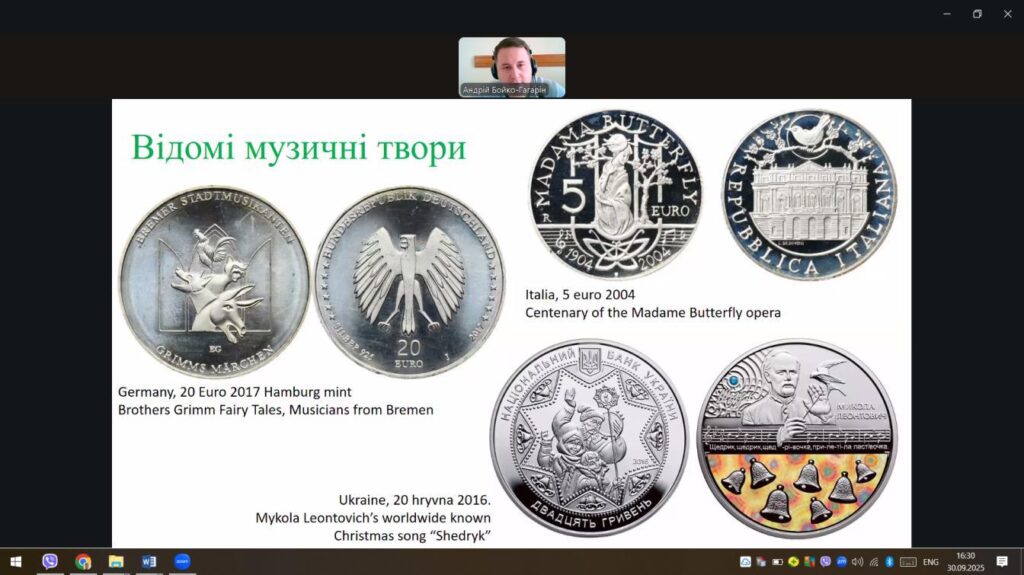Лектором заходу став Андрій Бойко-Татарін, доктор історичних наук, який представив унікальну лекцію про те, як музика і музичні інструменти відображені на монетах і медалях різних епох та країн. Учасники мали змогу побачити зображення античних денаріїв із лірами, європейських монет з арфами та скрипками, а також сучасних українських пам’ятних випусків, присвячених Миколі Леонтовичу та іншим діячам культури.