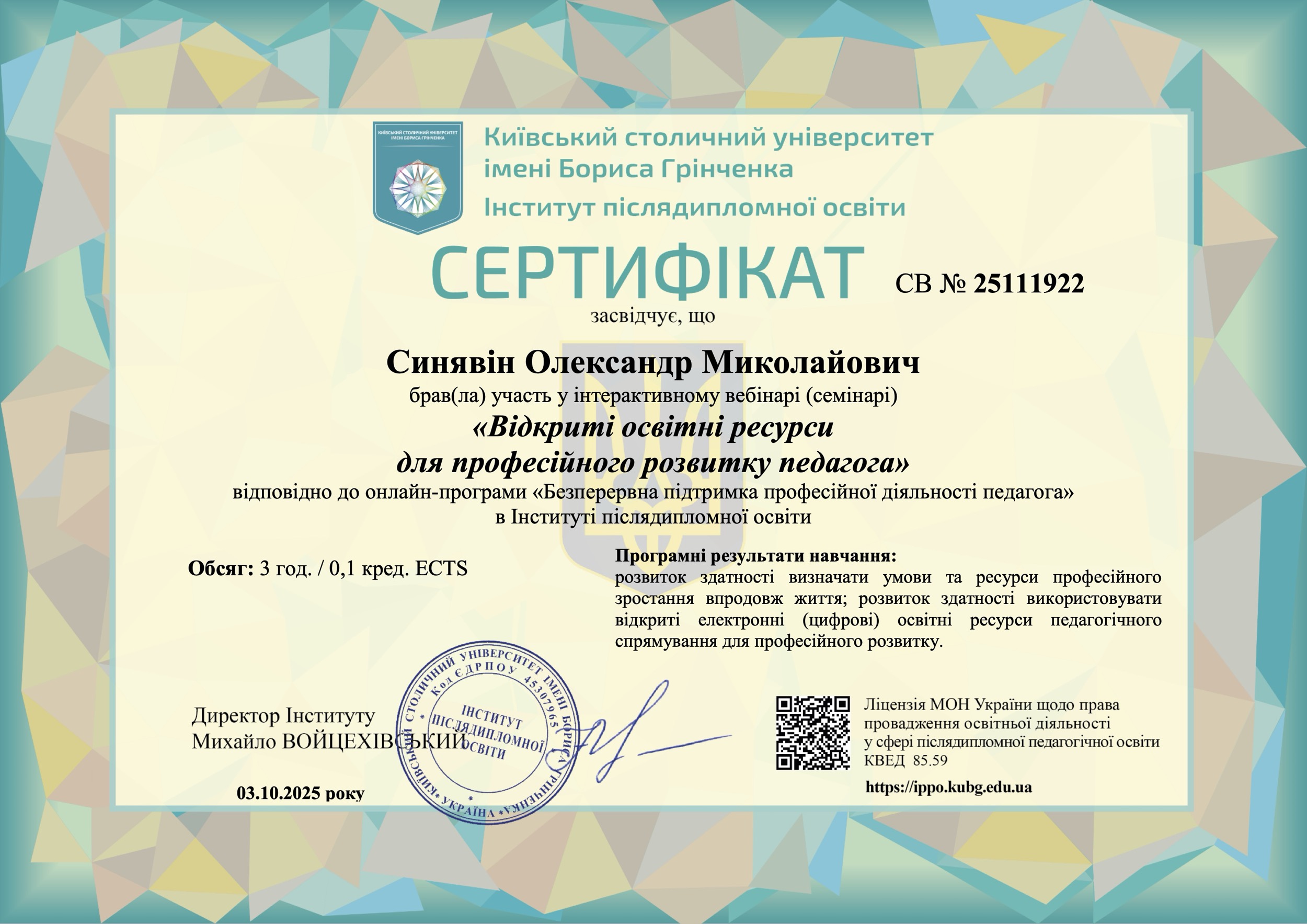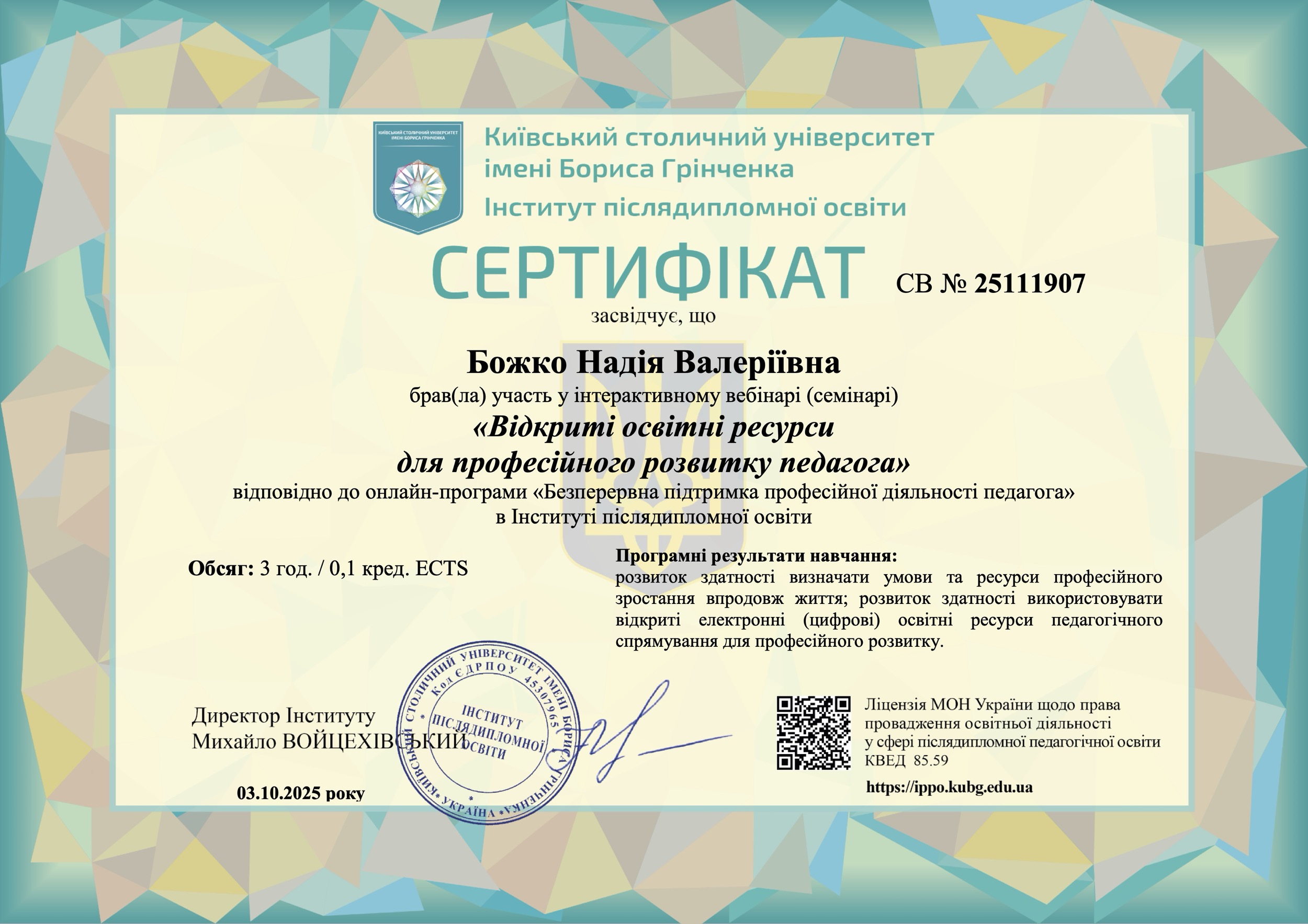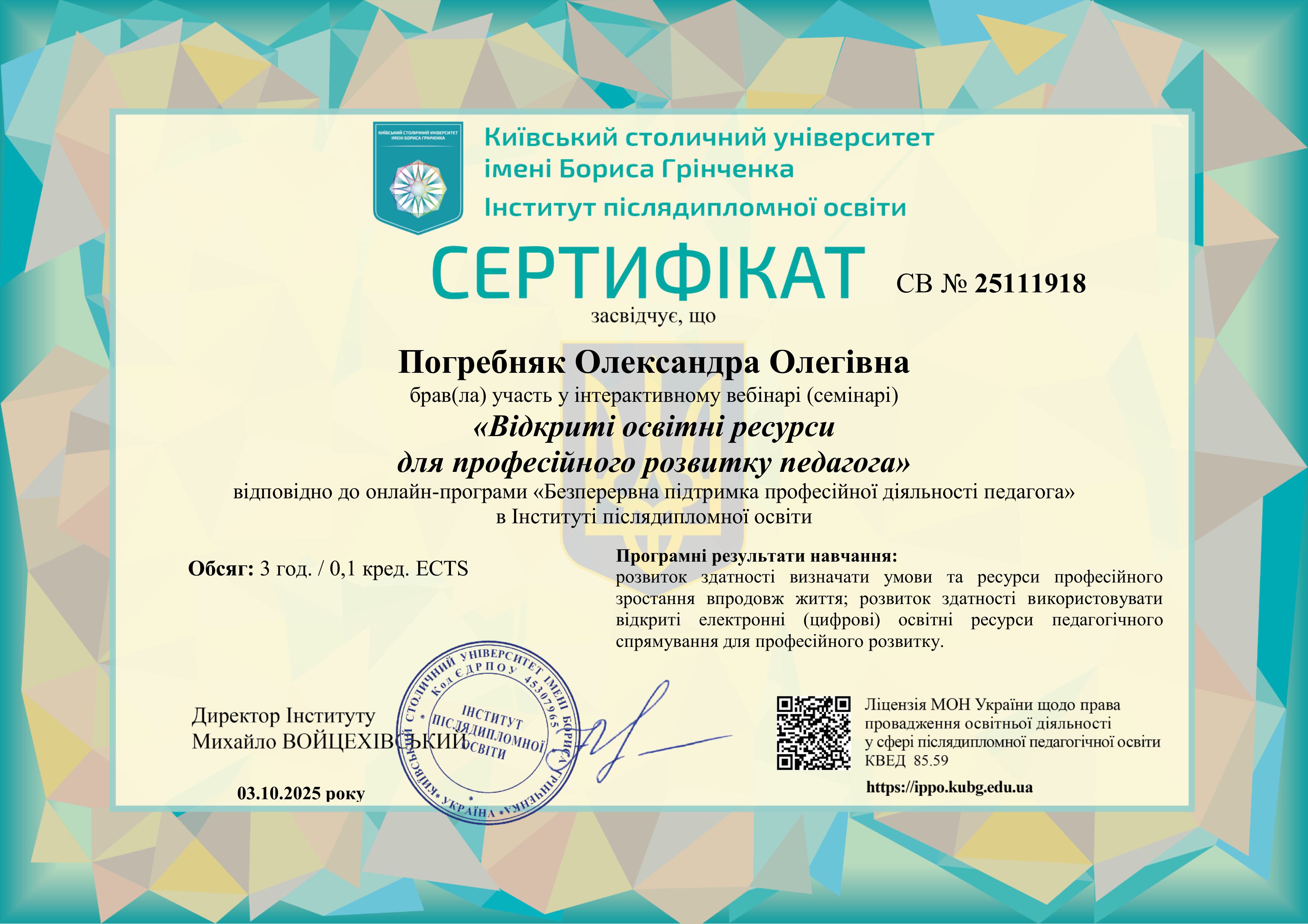 Участь у 3-годинному вебінарі (0,1 кредиту ЄКТС), що відбувся 03.10.2025 року, стала важливим кроком у забезпеченні високої якості навчального процесу та впровадженні інноваційних підходів у викладанні.