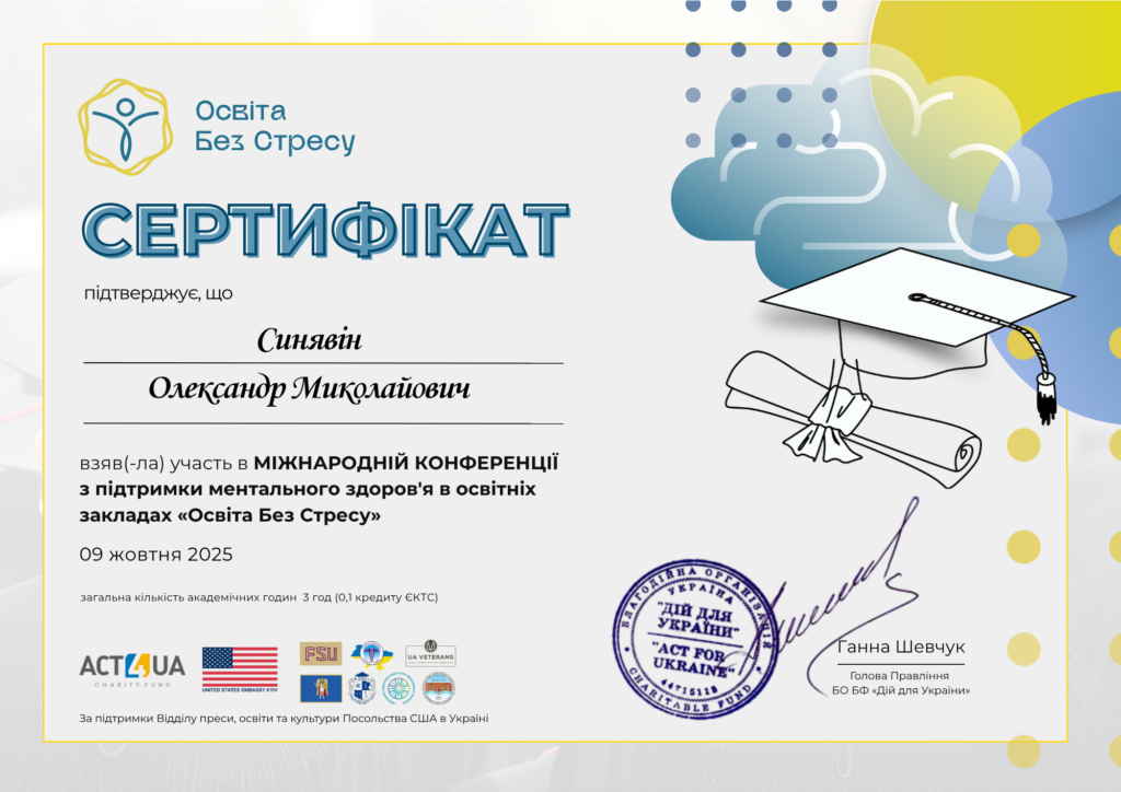У заході активну участь взяли викладачі нашого коледжу: Божко Надія та Синявін Олександр, продемонструвавши професійний інтерес до теми психічного благополуччя та сучасних освітніх практик. Учасники мали змогу ознайомитися з інноваційними американськими підходами, українським досвідом реалізації проєкту «Освіта без стресу», а також надихнутися виступами провідних експертів із Florida State University, Київського національного університету ім. Т. Шевченка, Університету «КРОК» та інших навчальних закладів.