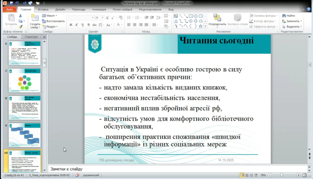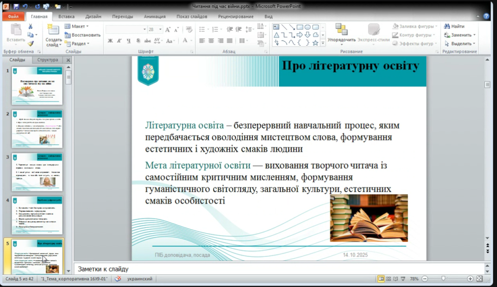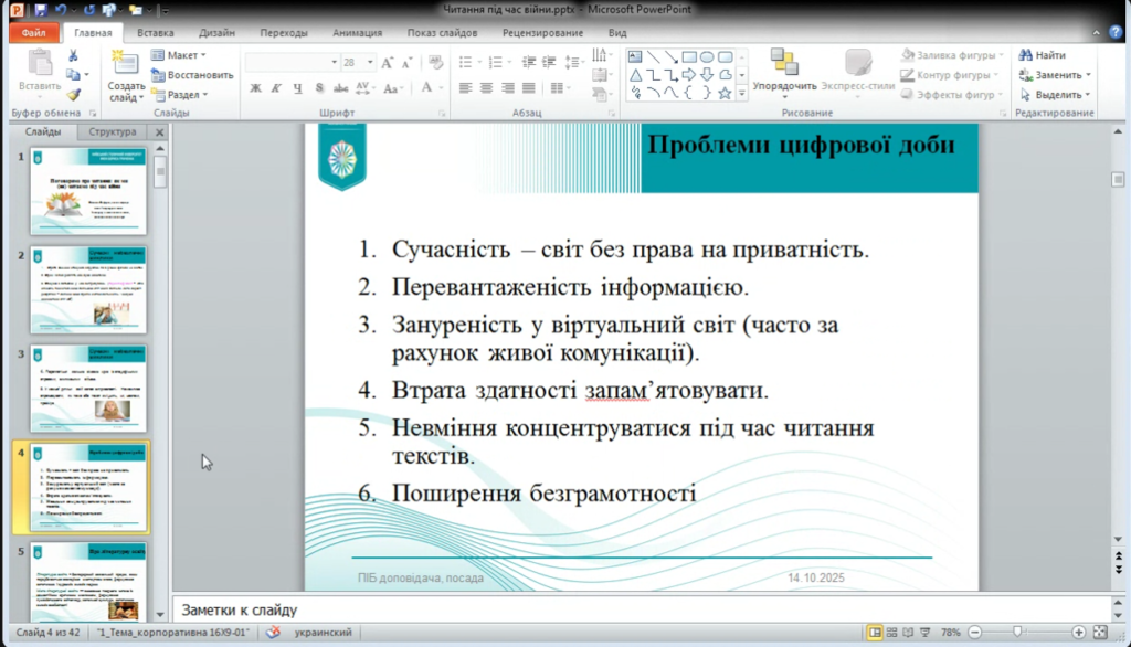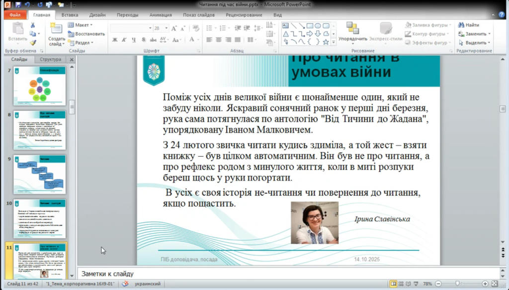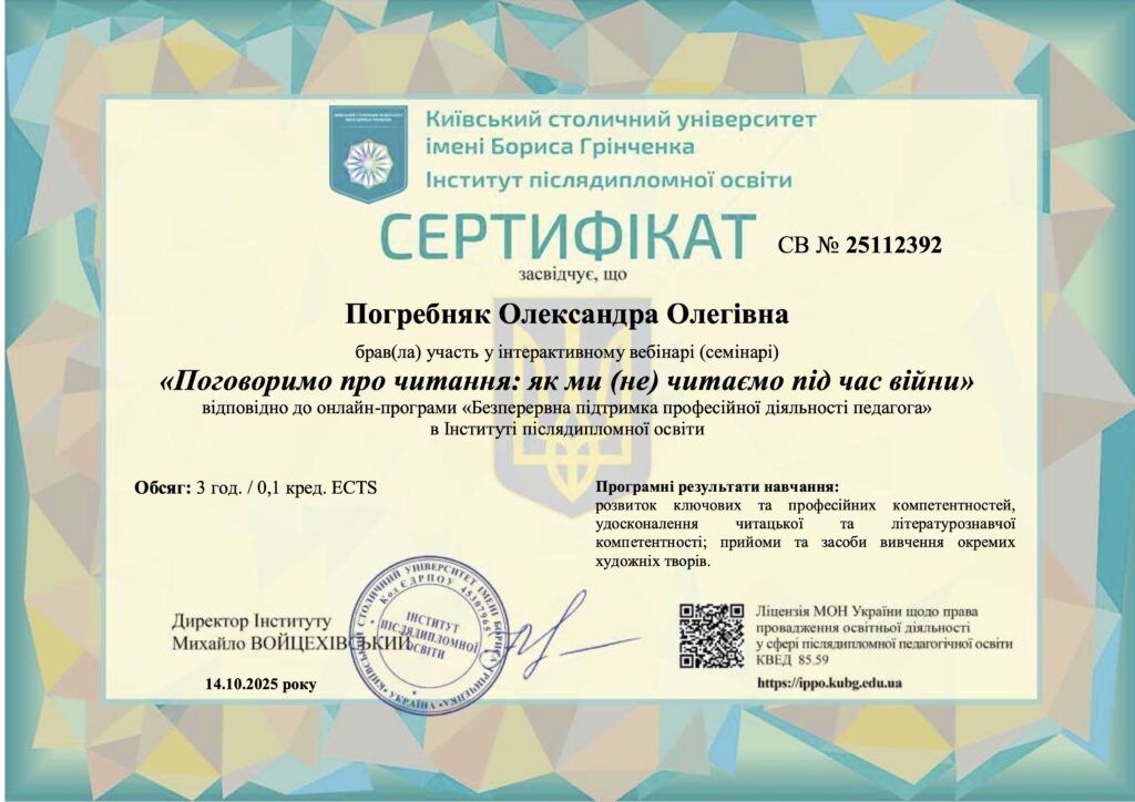14 жовтня 2025 року викладача Погребняк Олександра Олегівна долучилися до участі у вебінарі «Поговоримо про читання: як ми (не) читаємо під час війни». Захід порушив важливу і водночас болючу тему – зміну читацьких звичок українців у часи війни, коли щоденна реальність впливає не лише на психоемоційний стан, а й на здатність сприймати слово, концентруватися, відчувати зміст.