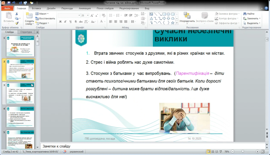 Під час вебінару обговорювалося, як стрес, втрата близьких людей, роз’єднаність родин, переїзди й постійна тривога позначаються на потребі в читанні. Особливо зворушливою була розмова про явище «парентифікації», коли діти змушені брати на себе роль підтримки для дорослих, що впливає на їхній емоційний стан і сприйняття текстів. Наголошували, що кожна дитина має власний запас витривалості, і важливо враховувати індивідуальні реакції на теми, пов’язані з війною.