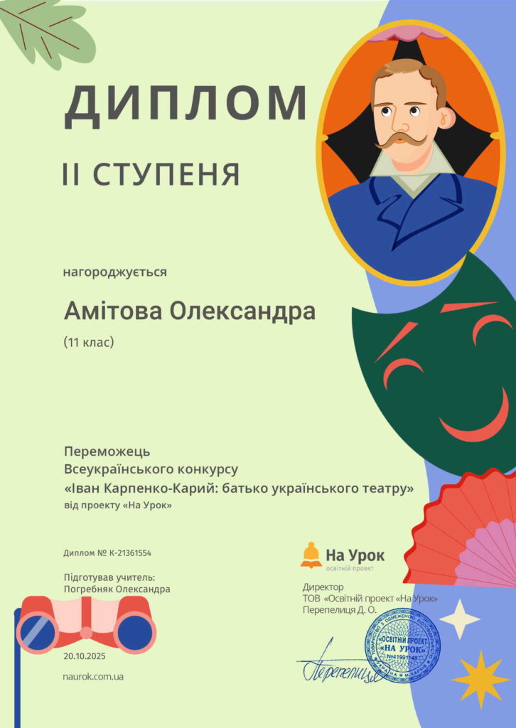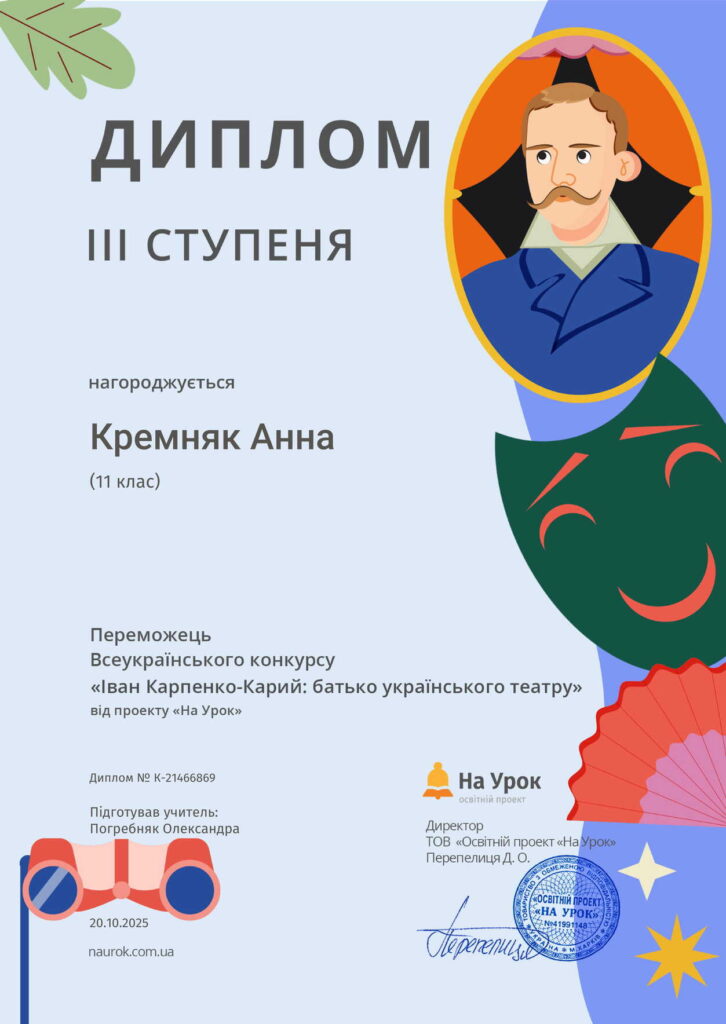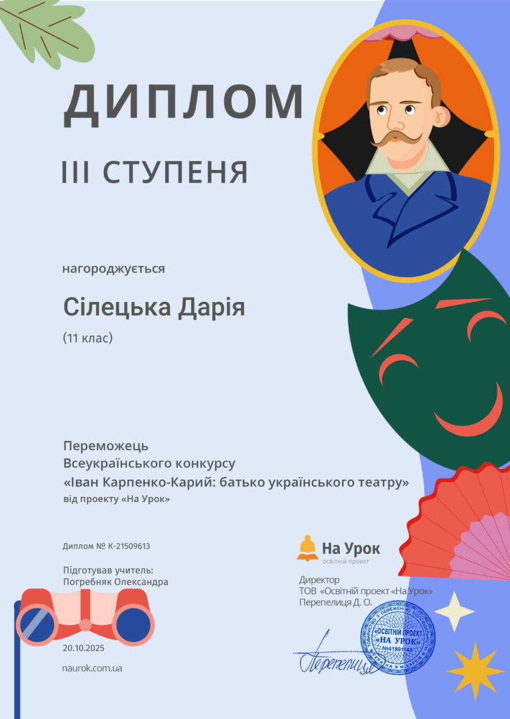 Студенти І та ІІ курсів (115, 125, 135, 145, 155, 215, 225, 235 та 255 групи) під керівництвом викладачки української мови і літератури, Погребняк Олександри Олегівни, гідно представили наш навчальний заклад у Всеукраїнському інтернет-конкурсі «Іван Карпенко-Карий: батько українського театру» та вибороли призові місця!
