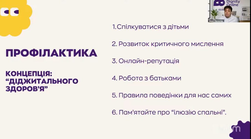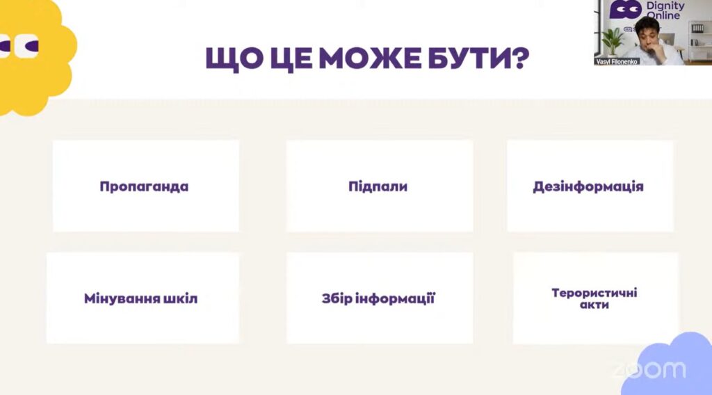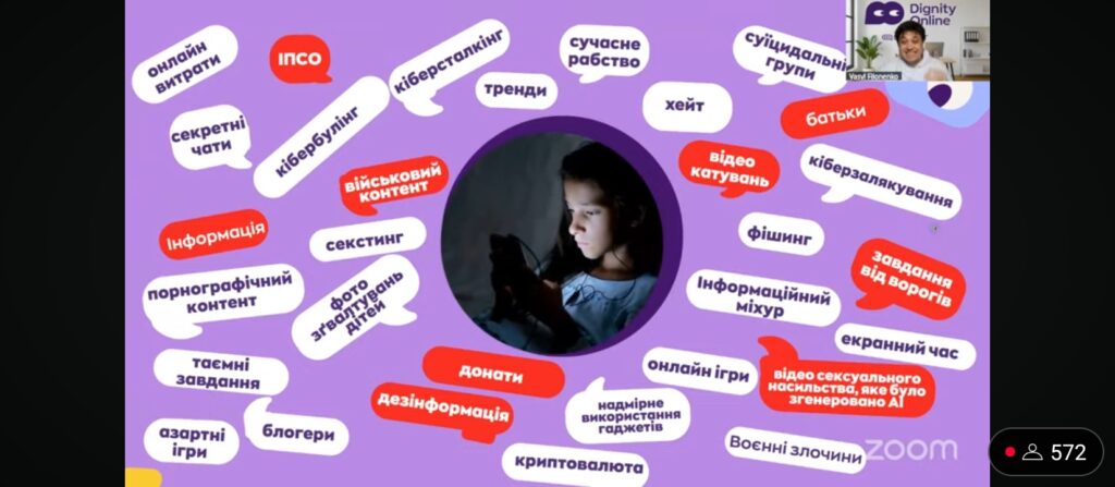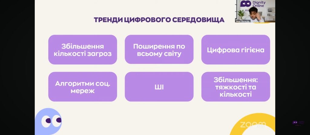 Під час вебінару учасники дізналися про новітні інтернет-тренди, що використовуються ворогом для кібератак та інформаційних маніпуляцій, а також про платформи та алгоритми, через які відбувається вербування дітей до протиправної або диверсійної діяльності. Особливу увагу було приділено темі цифрової безпеки, зокрема навчанню дітей розпізнавати фішингові повідомлення, уникати небезпечних онлайн-контактів, захищати персональні дані та вчасно повідомляти дорослих про підозрілі дії в мережі.
