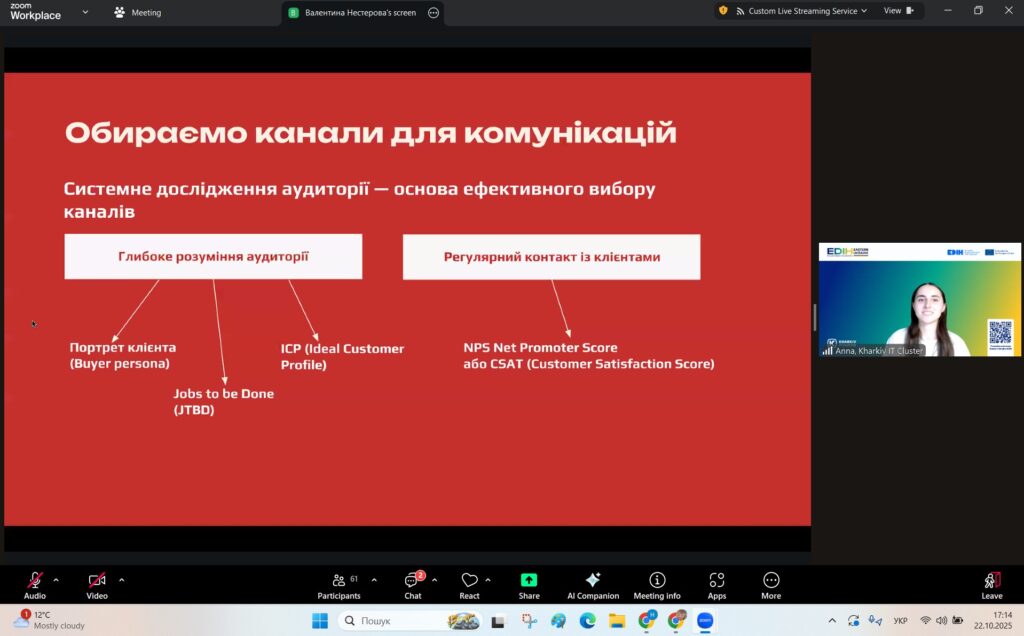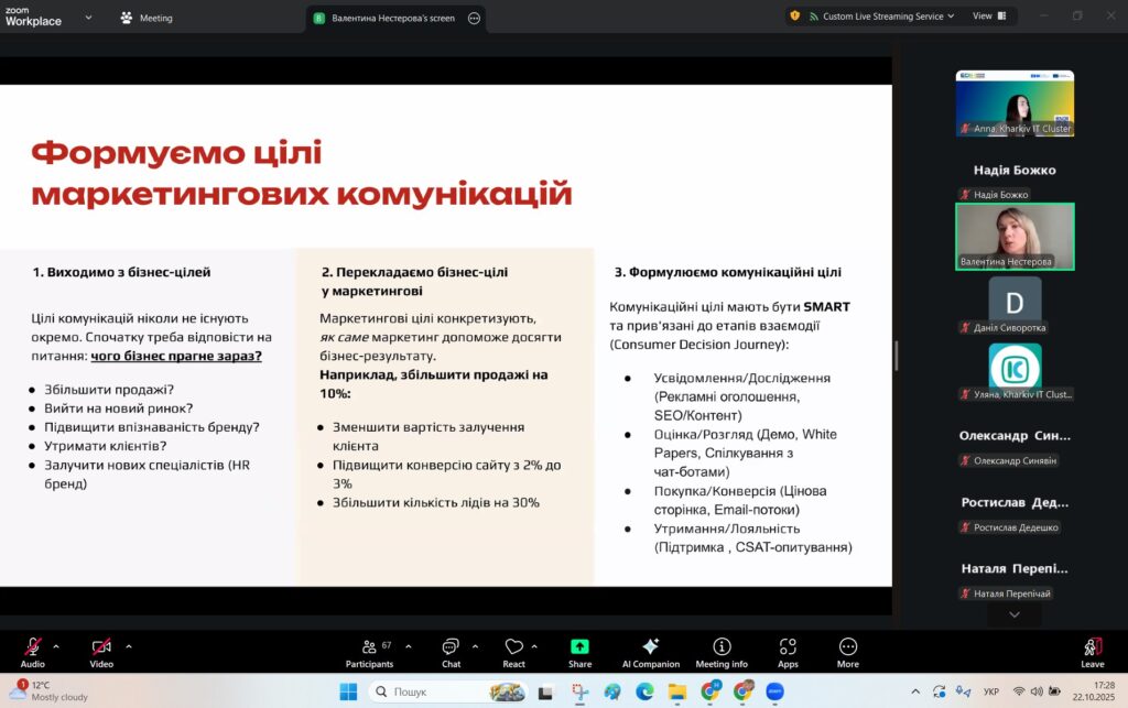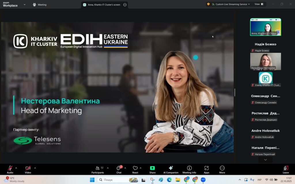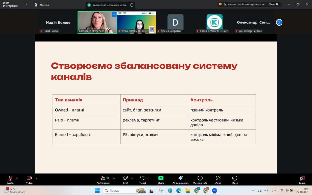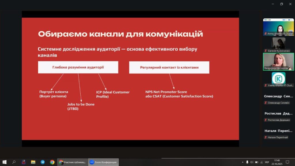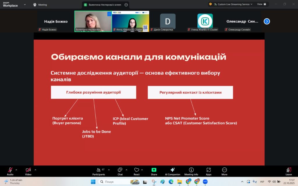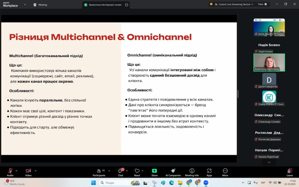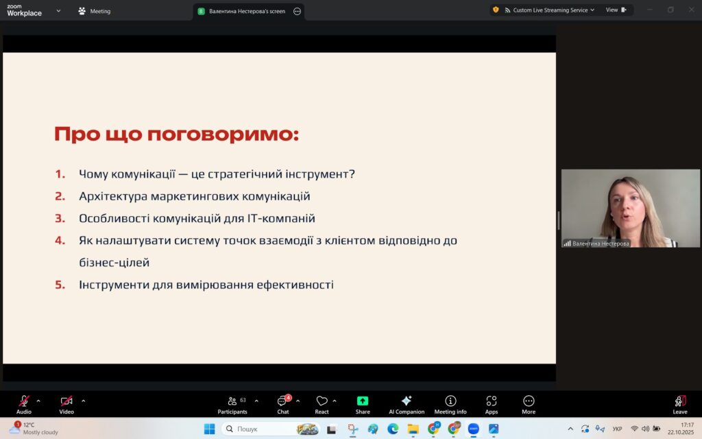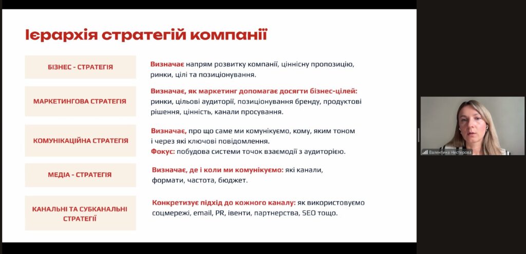 Спікеркою заходу виступила Валентина Нестерова, Head of Marketing у компанії Telesens, яка поділилася досвідом побудови ефективних маркетингових стратегій у сфері інформаційних технологій. Під час вебінару учасники дізналися про архітектуру маркетингових комунікацій, точки взаємодії з аудиторією, методи вимірювання ефективності, а також обговорили різницю між Multichannel та Omnichannel підходами.
