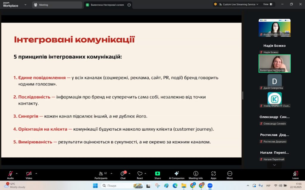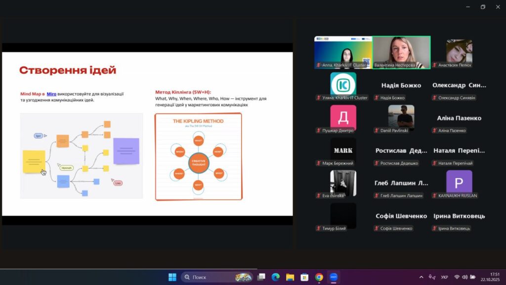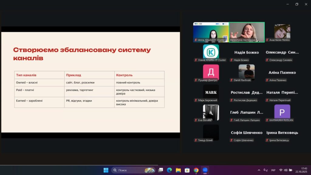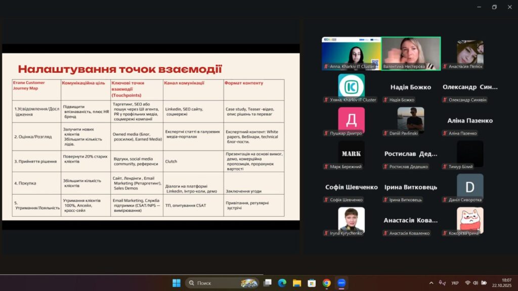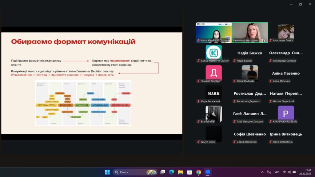 22 жовтня 2025 року студенти спеціальностей F3 «Комп’ютерні науки» та F7/123 «Комп’ютерна інженерія» разом із викладачами Олександром Синявіним та Надією Божко взяли участь у вебінарі Open IT на тему «Стратегічні маркетингові комунікації в IT: будуємо систему точок взаємодії».