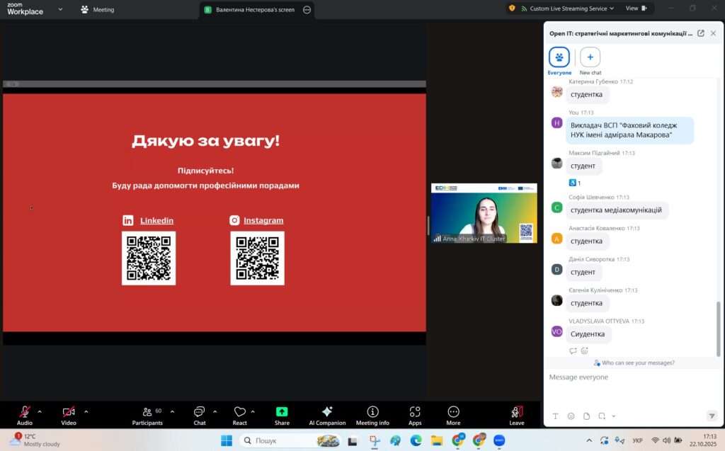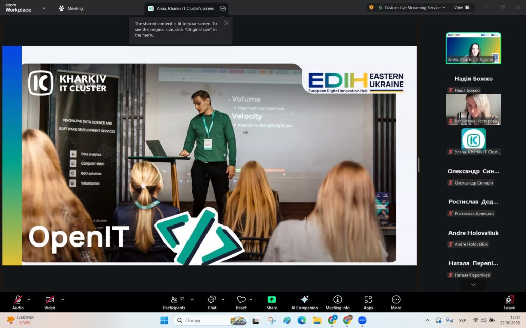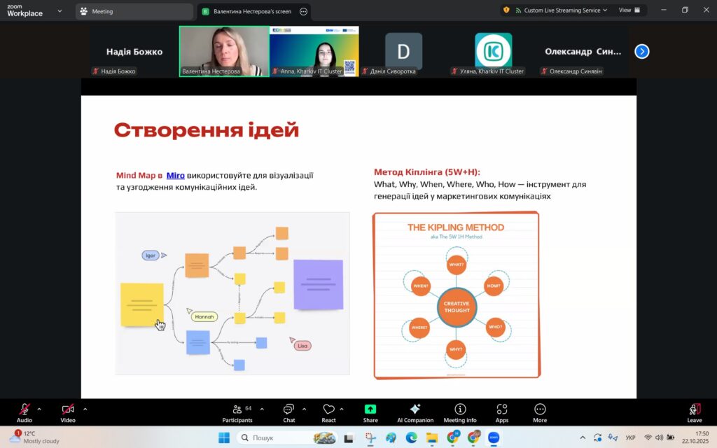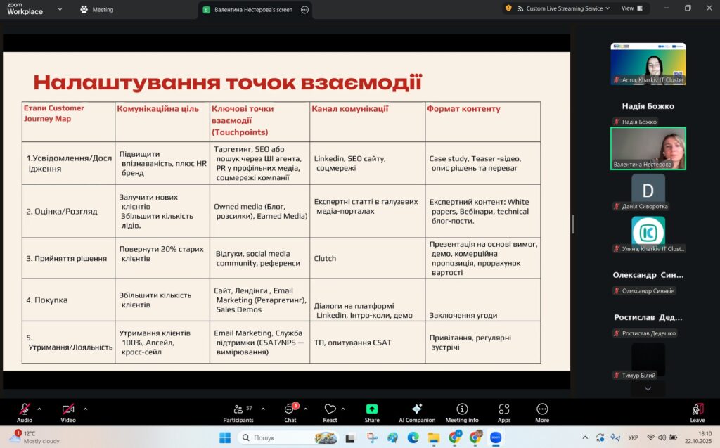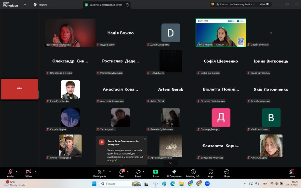 22 жовтня 2025 року студенти спеціальностей F3 «Комп’ютерні науки» та F7/123 «Комп’ютерна інженерія» разом із викладачами Олександром Синявіним та Надією Божко взяли участь у вебінарі Open IT на тему «Стратегічні маркетингові комунікації в IT: будуємо систему точок взаємодії».