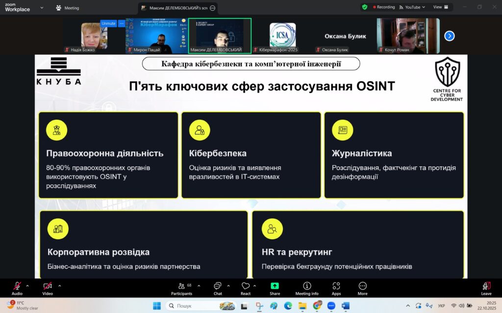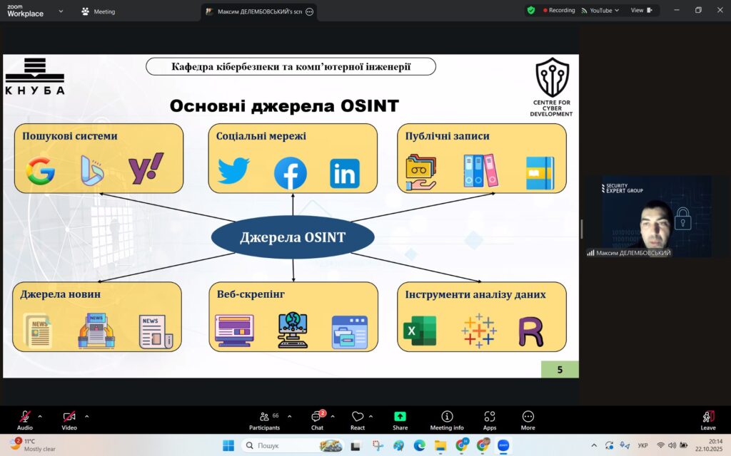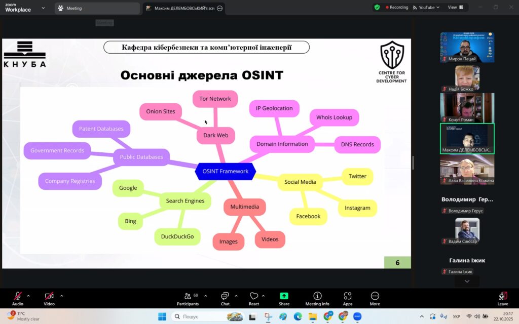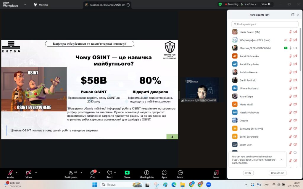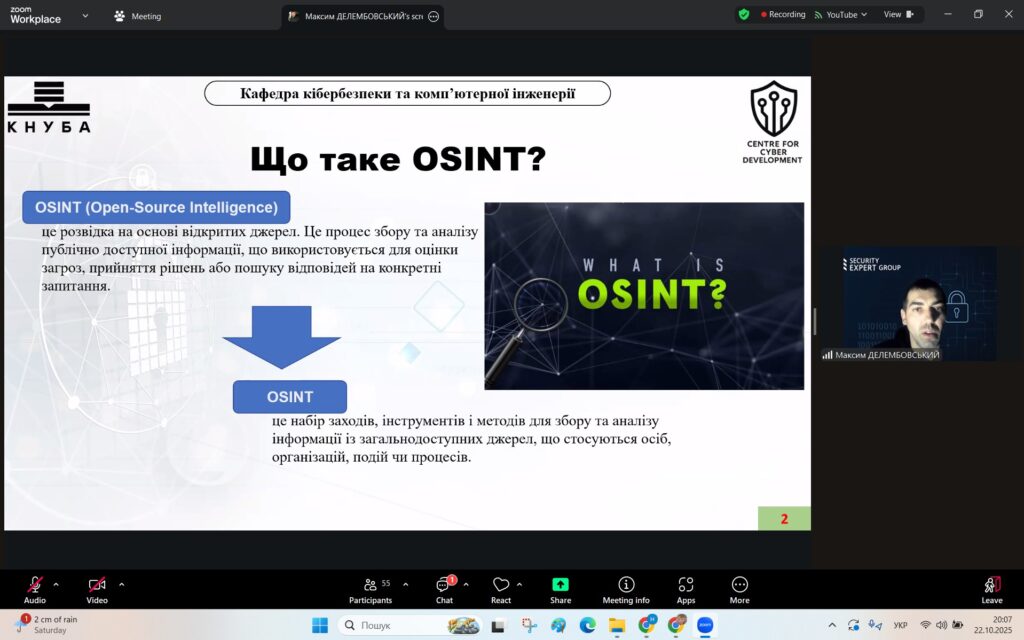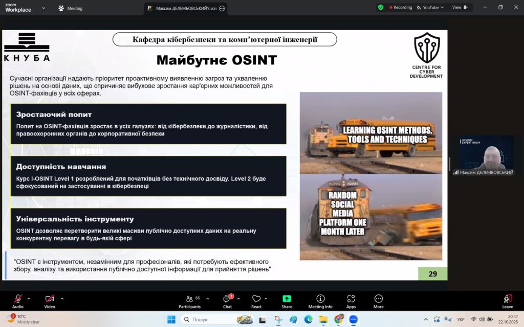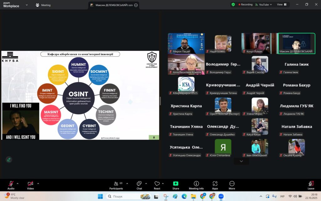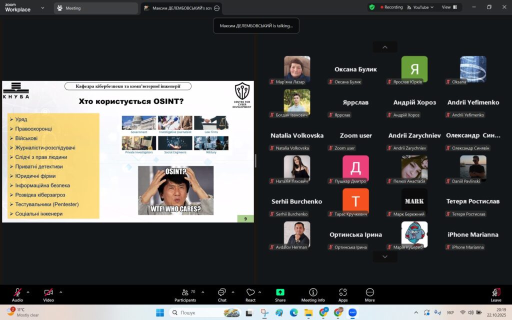 У рамках Місяця кібербезпеки в Україні 22 жовтня 2025 року студенти спеціальностей F3 «Комп’ютерні науки» та F7/123 «Комп’ютерна інженерія» разом із викладачами Надією Божко та Олександром Синявіним взяли участь у надзвичайно пізнавальній лекції на тему «OSINT – навичка майбутнього та її значення для різних професій».