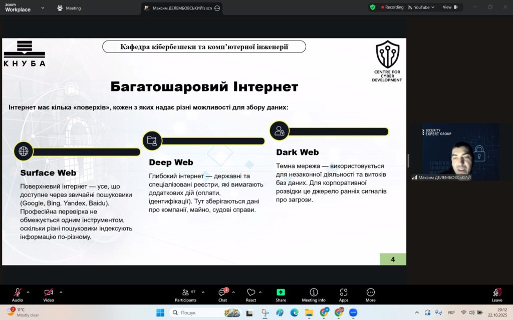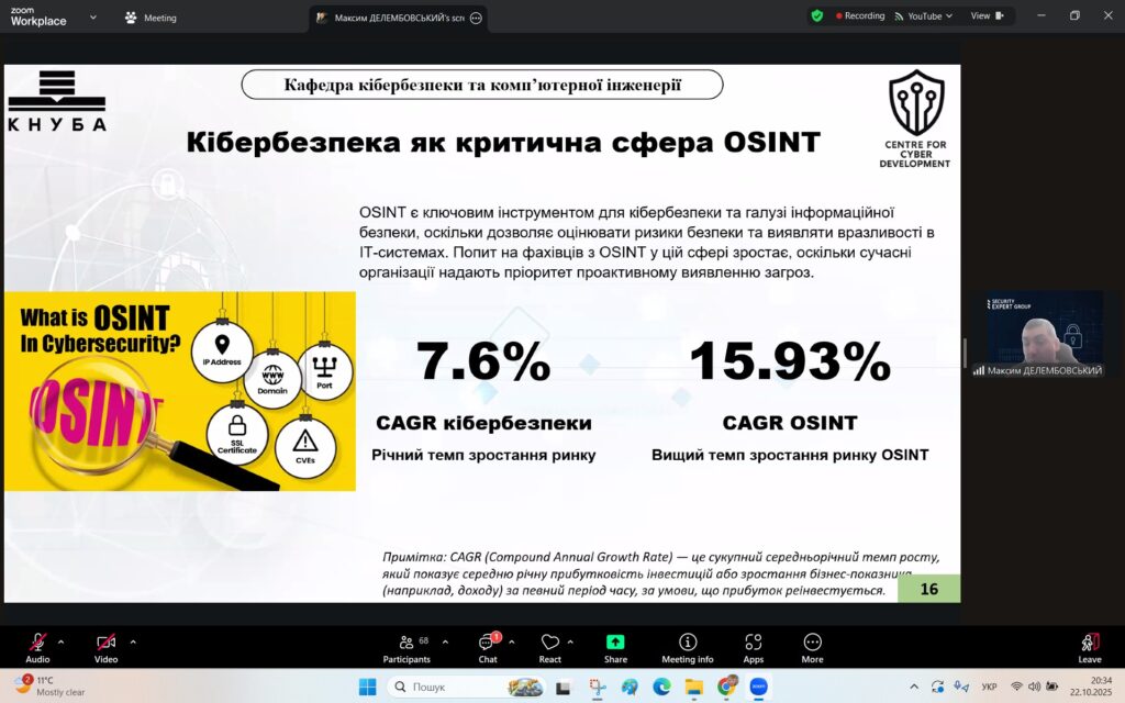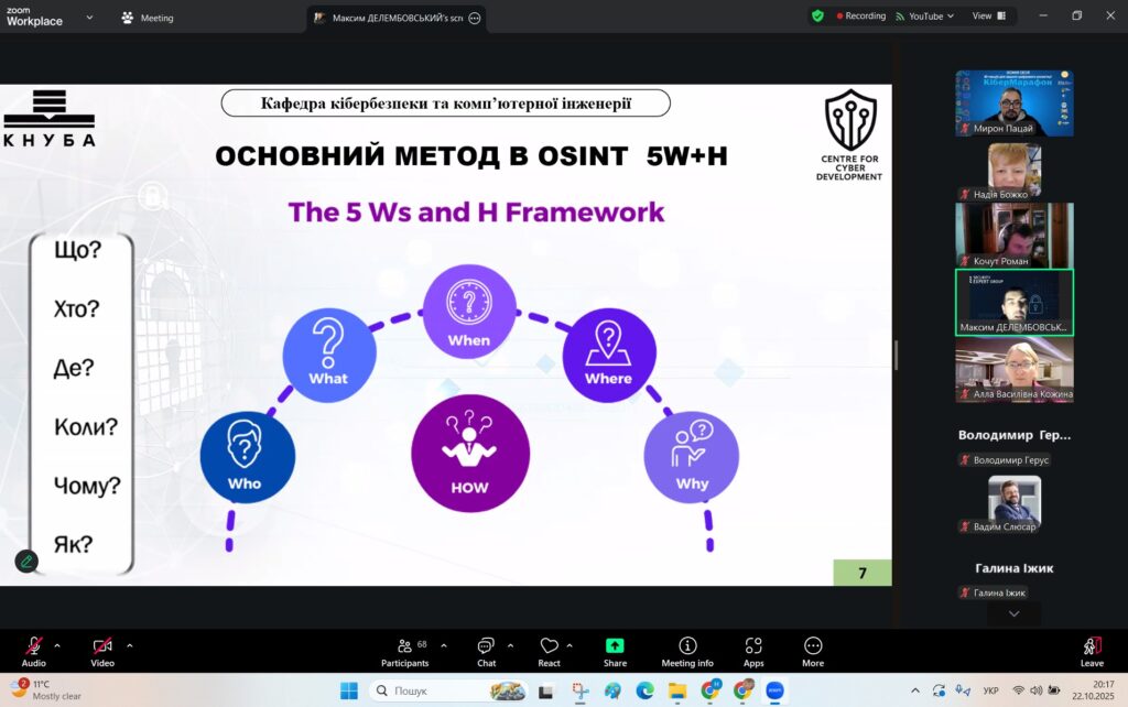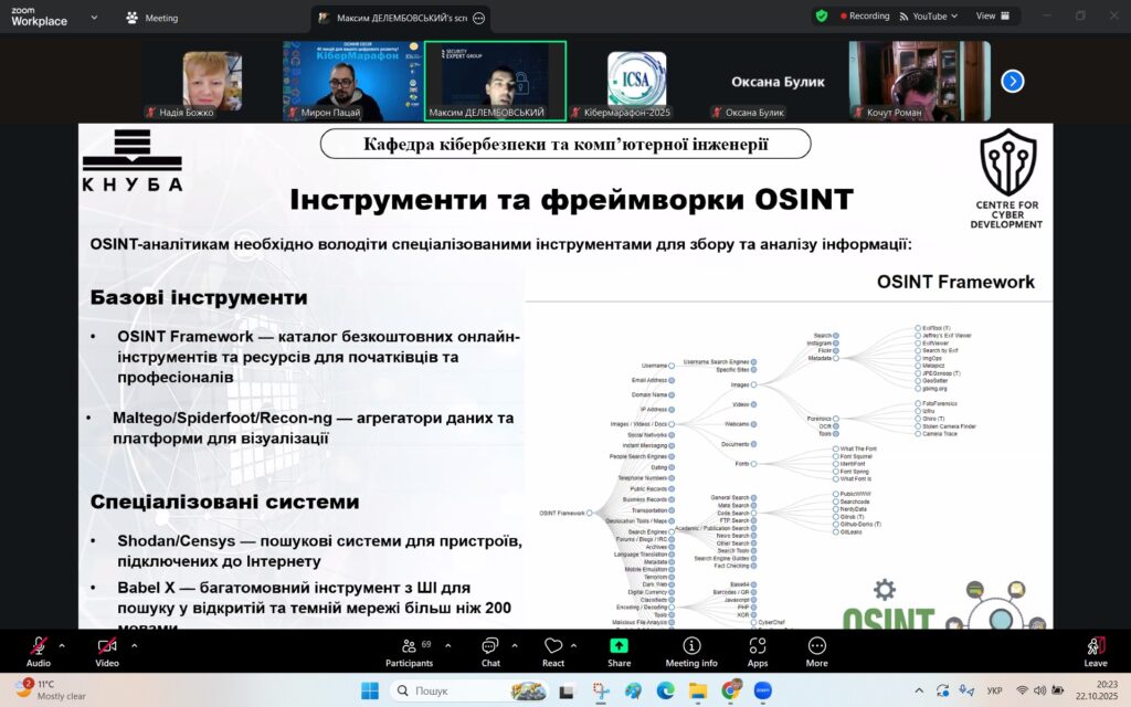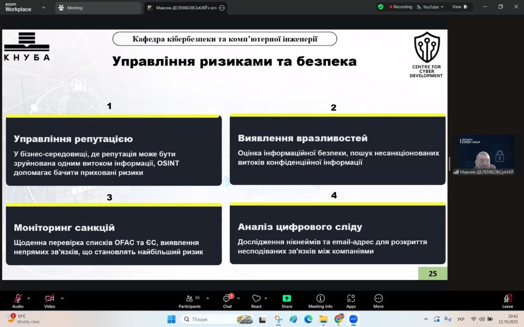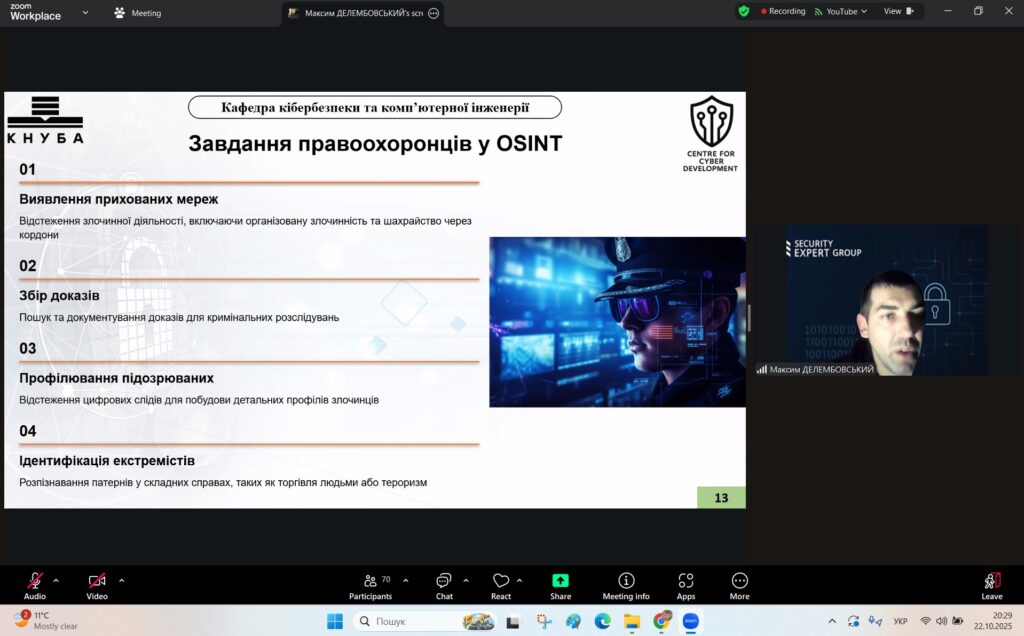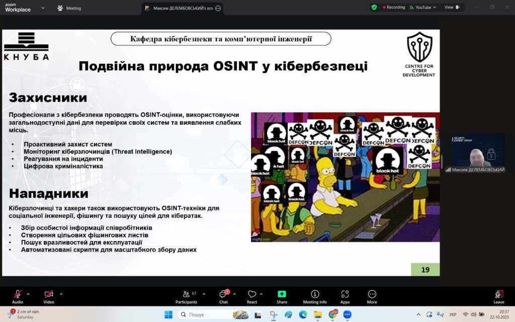 У рамках Місяця кібербезпеки в Україні 22 жовтня 2025 року студенти спеціальностей F3 «Комп’ютерні науки» та F7/123 «Комп’ютерна інженерія» разом із викладачами Надією Божко та Олександром Синявіним взяли участь у надзвичайно пізнавальній лекції на тему «OSINT – навичка майбутнього та її значення для різних професій».