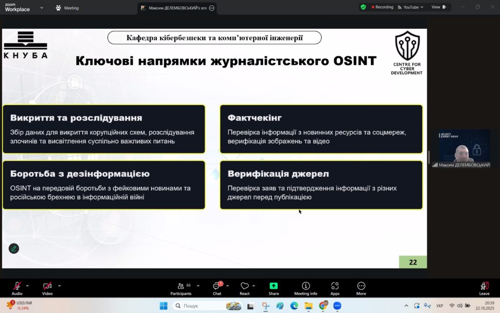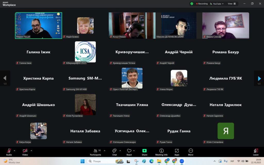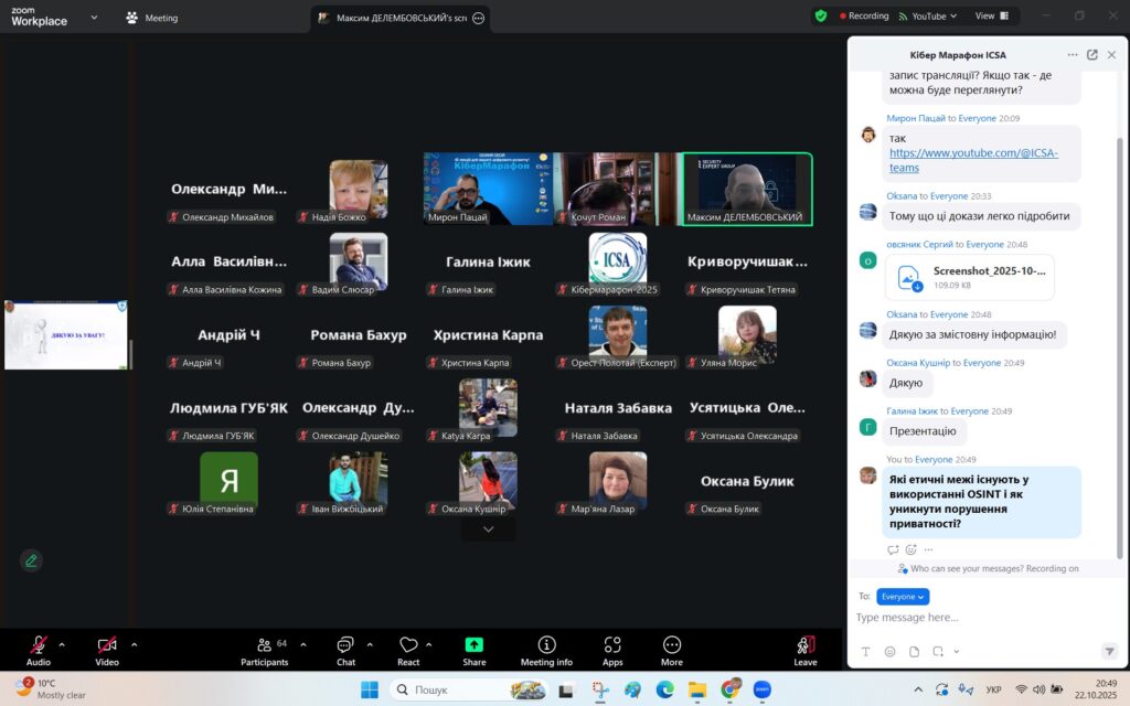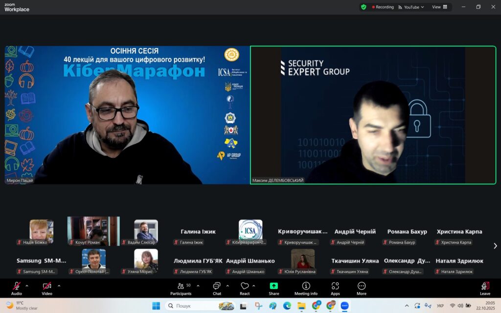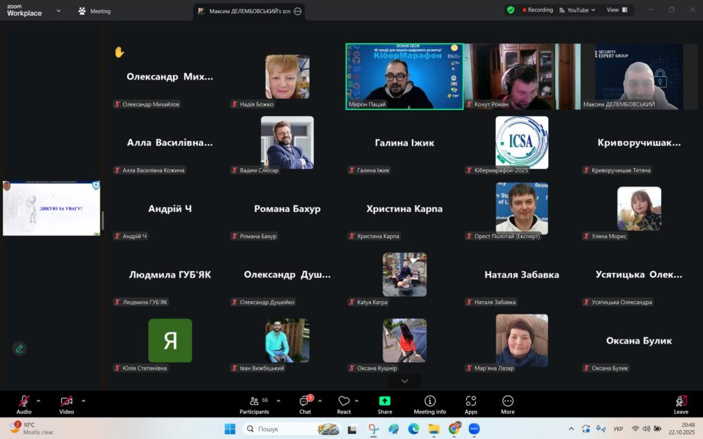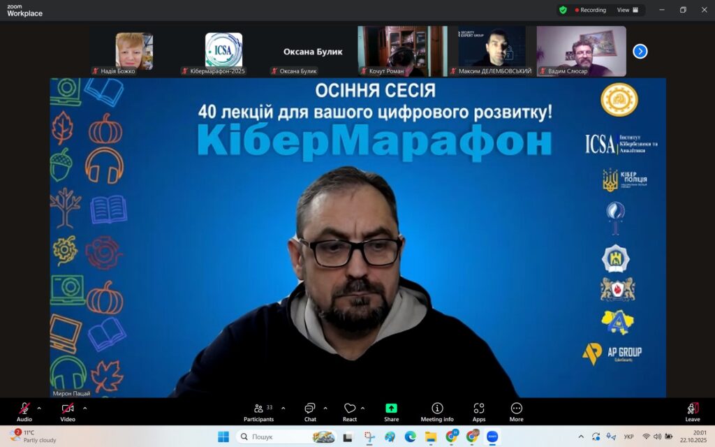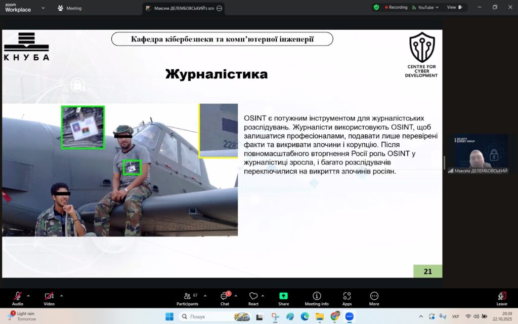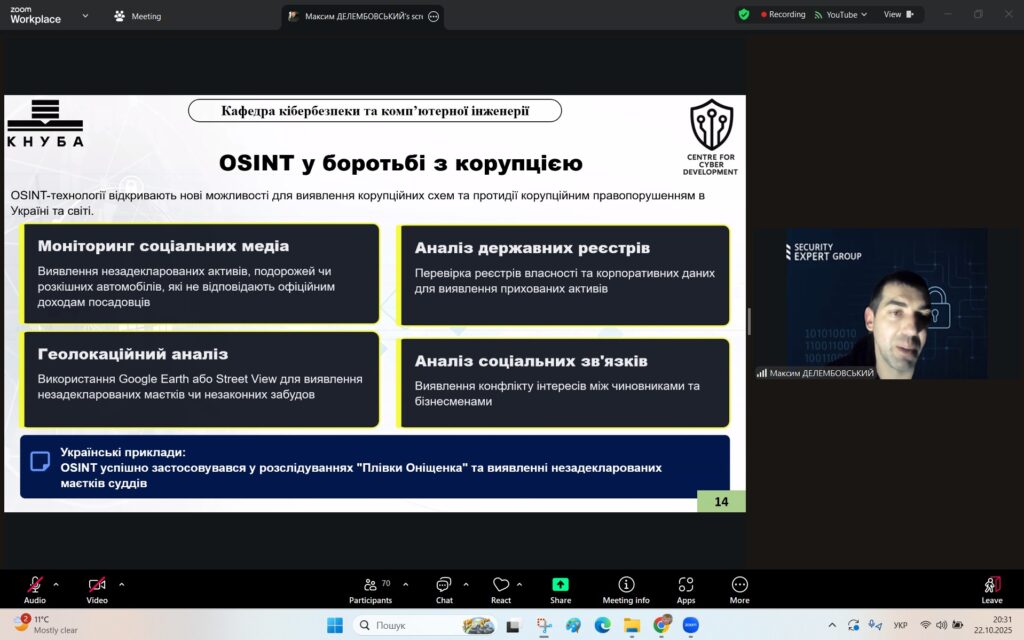 У рамках Місяця кібербезпеки в Україні 22 жовтня 2025 року студенти спеціальностей F3 «Комп’ютерні науки» та F7/123 «Комп’ютерна інженерія» разом із викладачами Надією Божко та Олександром Синявіним взяли участь у надзвичайно пізнавальній лекції на тему «OSINT – навичка майбутнього та її значення для різних професій».