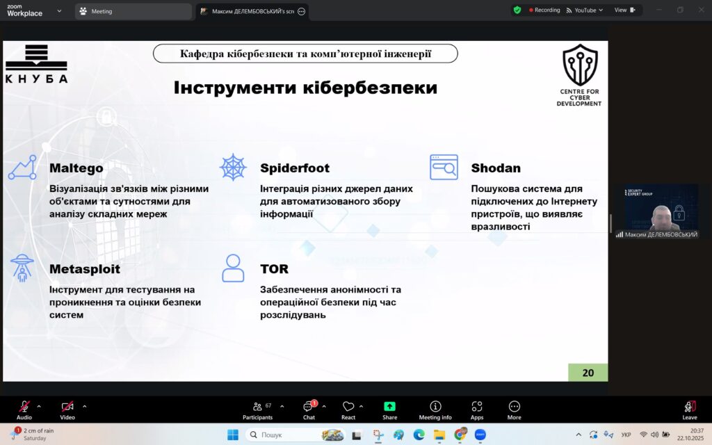 Лектором став Максим Делембовський – завідувач кафедри кібербезпеки та комп’ютерної інженерії КНУБА, кандидат технічних наук, доцент, експерт Наукової асоціації кібербезпеки України, Інституту дослідження кібервійни, керівник ГО «Центр кіберрозвитку», а також сертифікований тренер EC-Council та Cisco Academy.