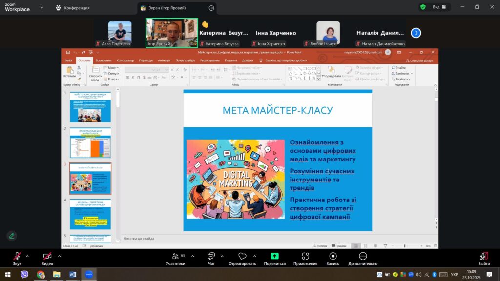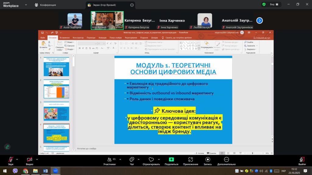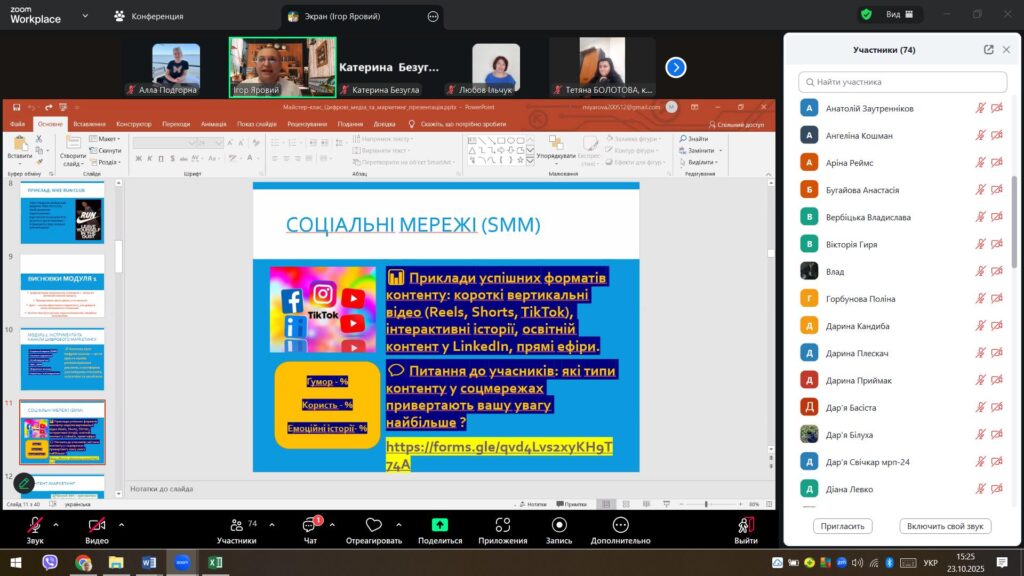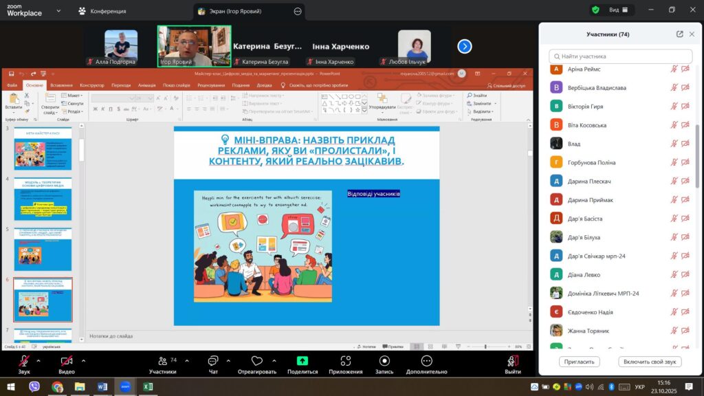 23 жовтня 2025 року здобувачі освіти 3 курсу спеціальності «072 Фінанси, банківська справа, страхування та фондовий ринок» разом із викладачем економічних дисциплін Подгорною А. О. взяли участь у майстер-класі до Дня маркетолога.