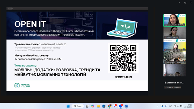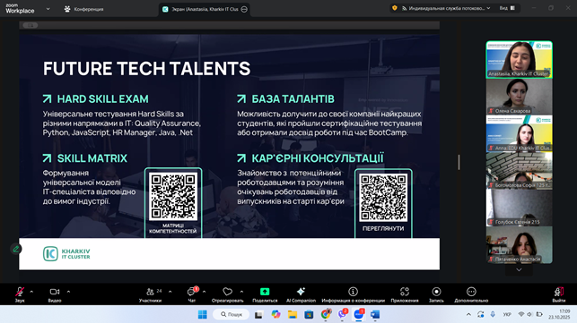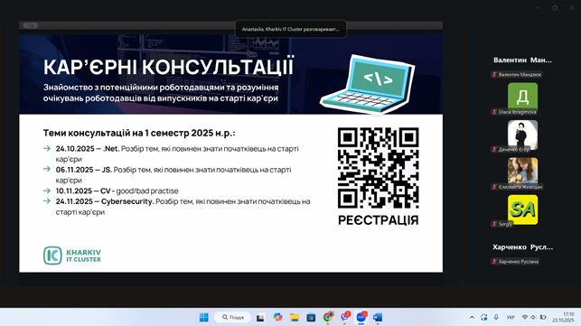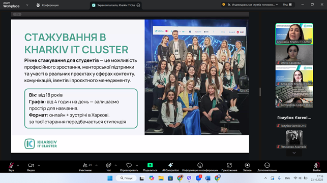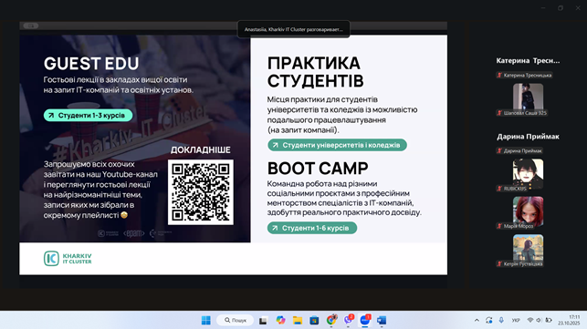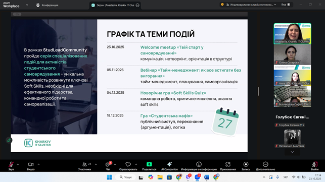 23 жовтня 202 року студентське самоврядування та активні студенти нашого коледжу долучилися до нового сезону проєкту #StudLeadCommunity від Kharkiv IT Cluster. Це перша з зустрічей нового сезону стане Welcome meetup «Твій старт у самоврядуванні», проведена з метою розвитку, підтримки та популяризації студентського самоврядування, а також сприяння формуванню soft skills студентської молоді.