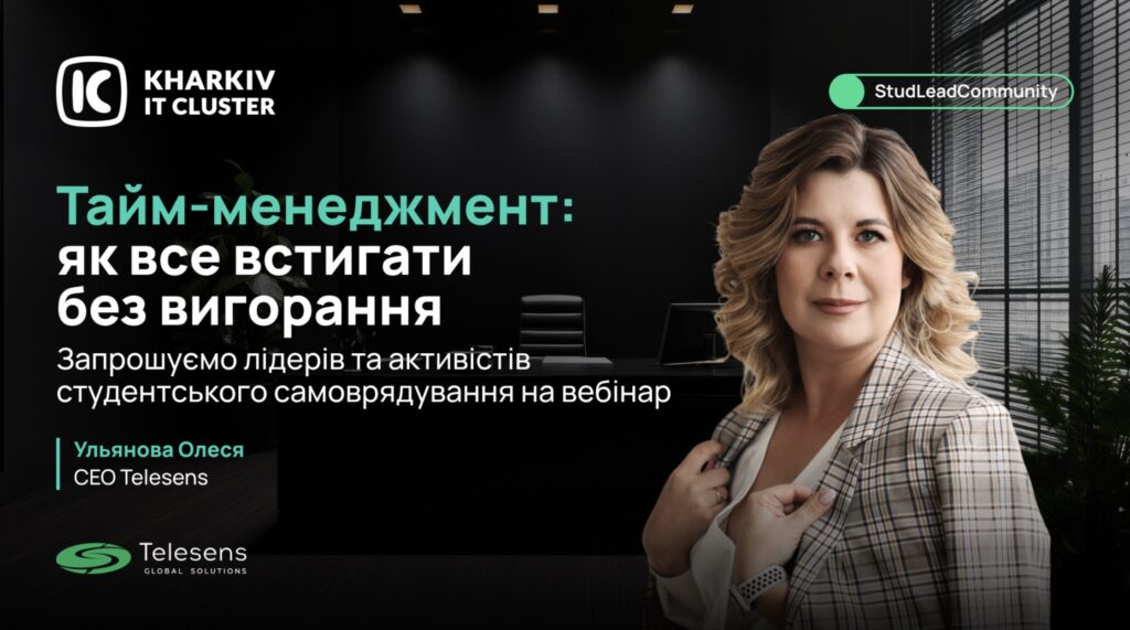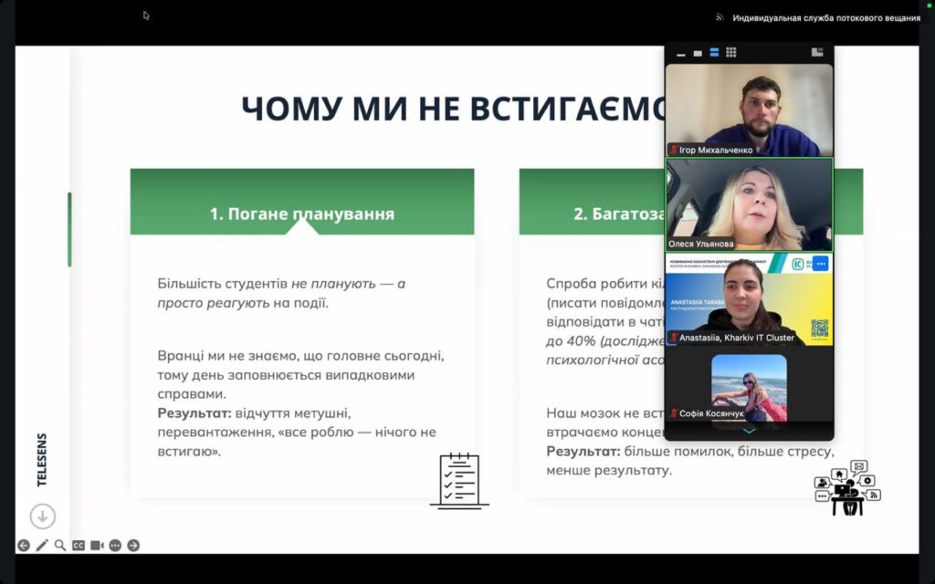 5 листопада 2025 року студенти спеціальностей F3 «Комп’ютерні науки» та F7/123 «Комп’ютерна інженерія» разом із викладачами Надією Божко, Олександром Синявіним та Ігорем Михальченко взяли участь у вебінарі #StudLeadCommunity: «Тайм-менеджмент: як все встигати без вигорання», організованому Kharkiv IT Cluster. Онлайн-зустріч провела Олеся Ульянова, CEO Telesens, яка поділилася практичними порадами щодо ефективного планування часу, подолання прокрастинації та підтримки балансу між навчанням, роботою і особистим життям.