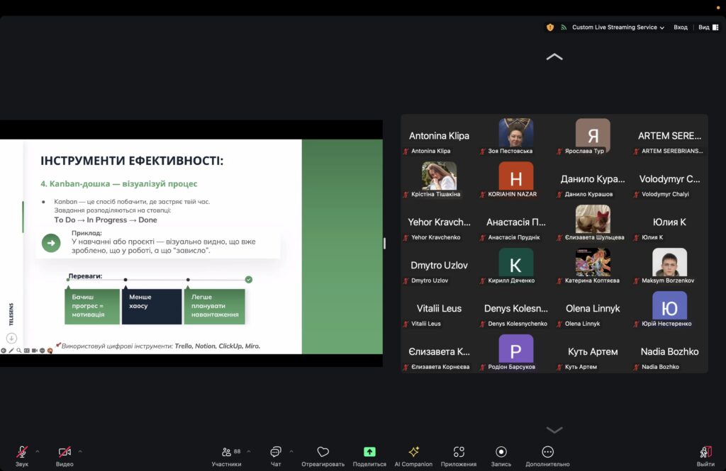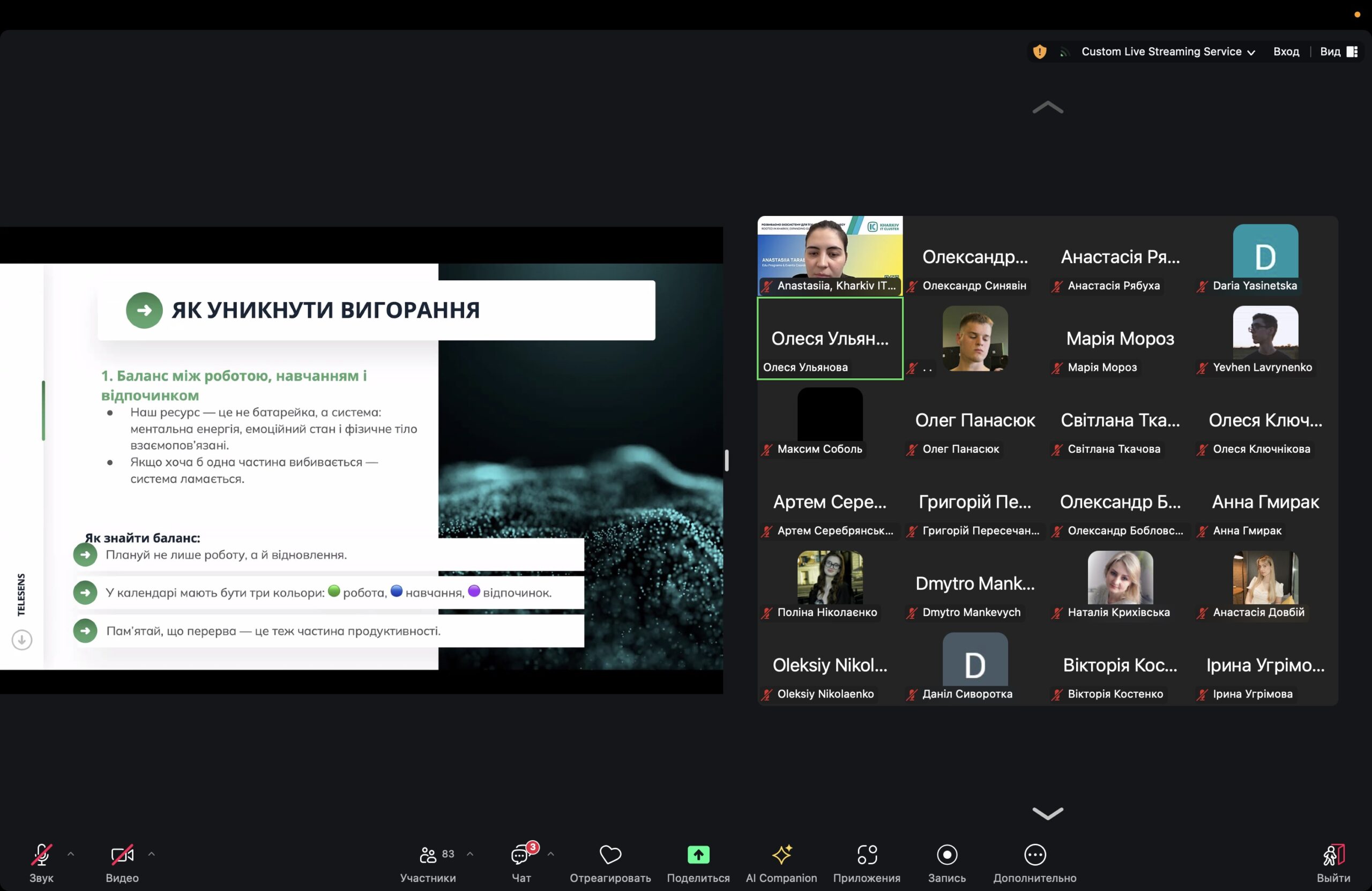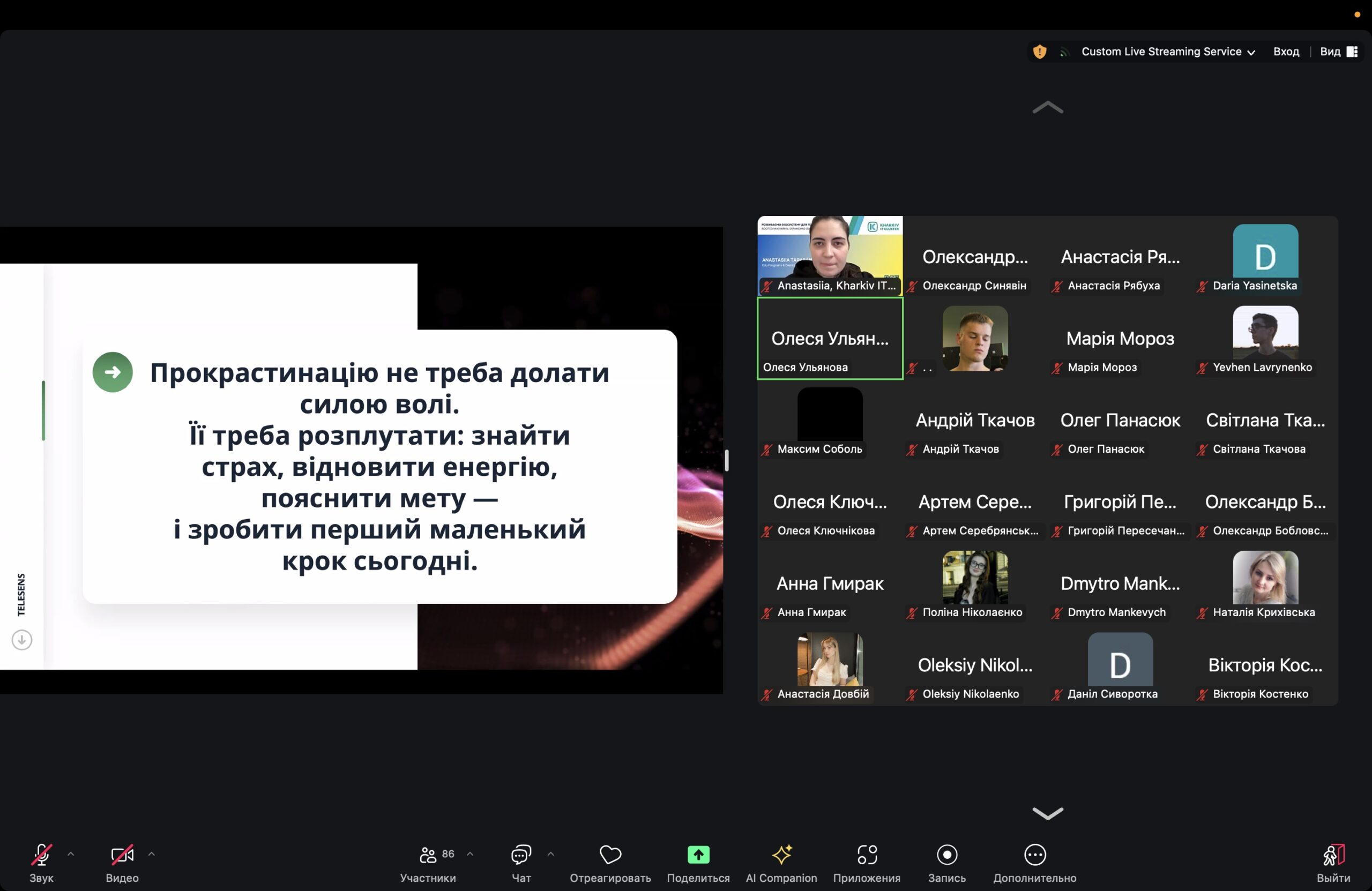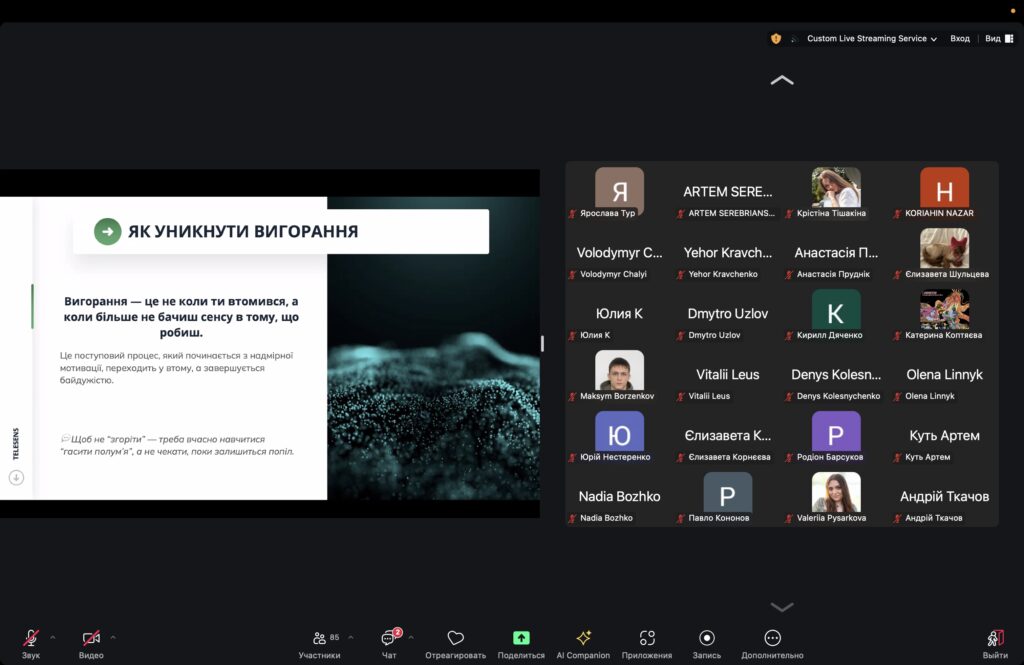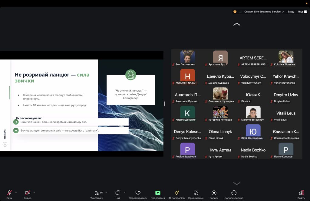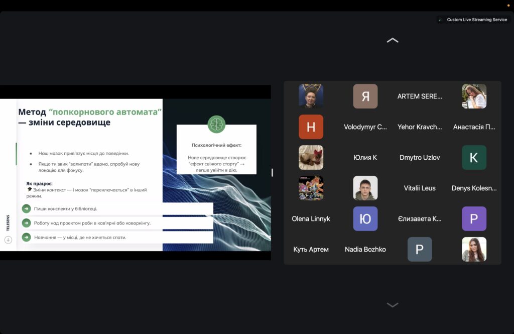 Під час вебінару студенти та викладачі дізналися, як уникати стресу та вигорання, зберігати мотивацію та створювати систему, у якій час працює на них. Особливу увагу було приділено практичним методам тайм-менеджменту, які допомагають жити у власному темпі, залишаючись ефективними та продуктивними.