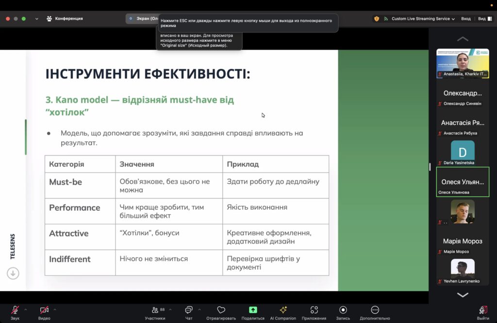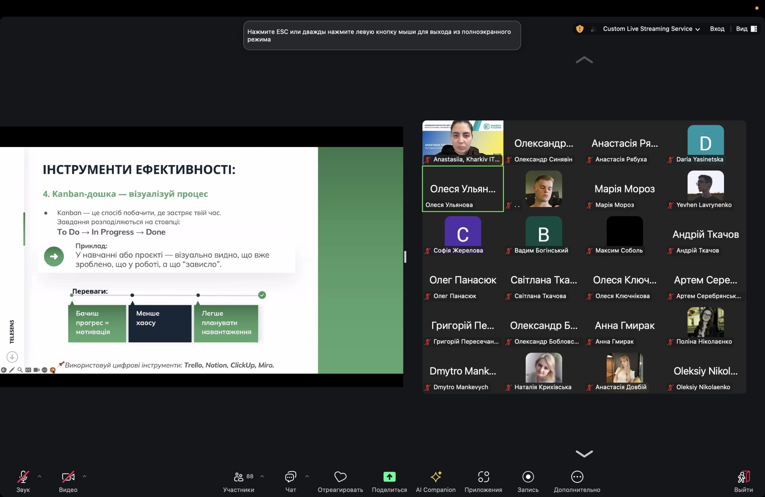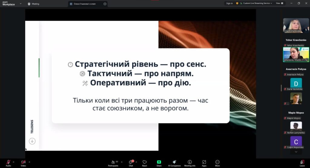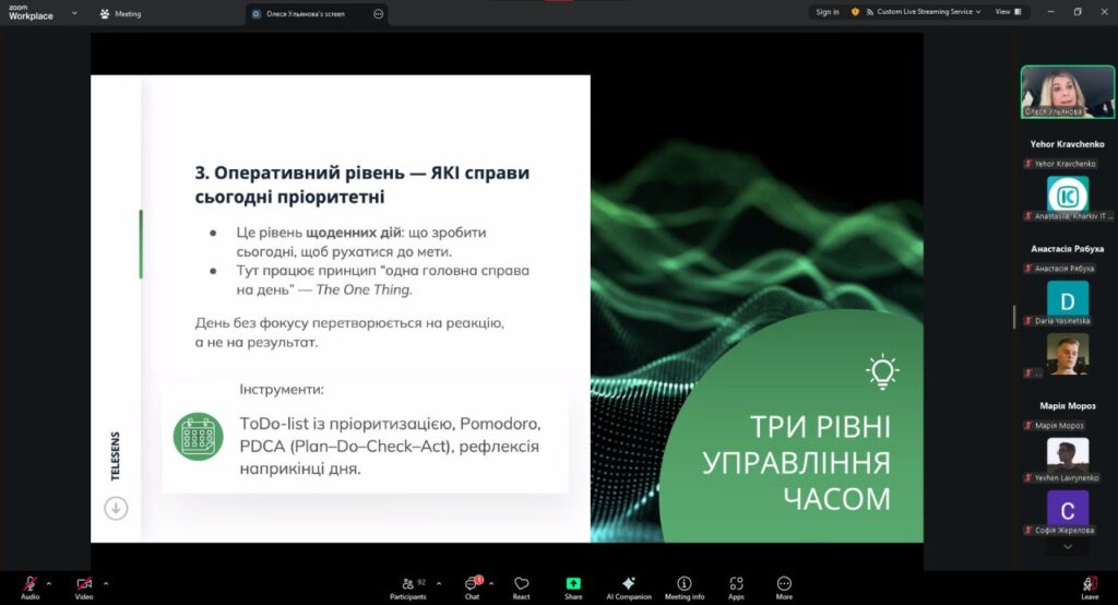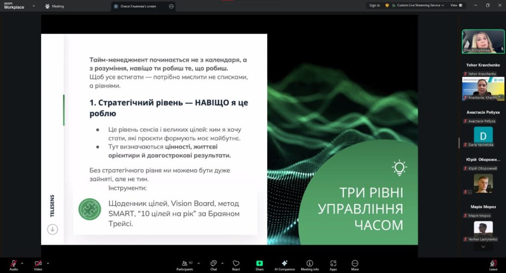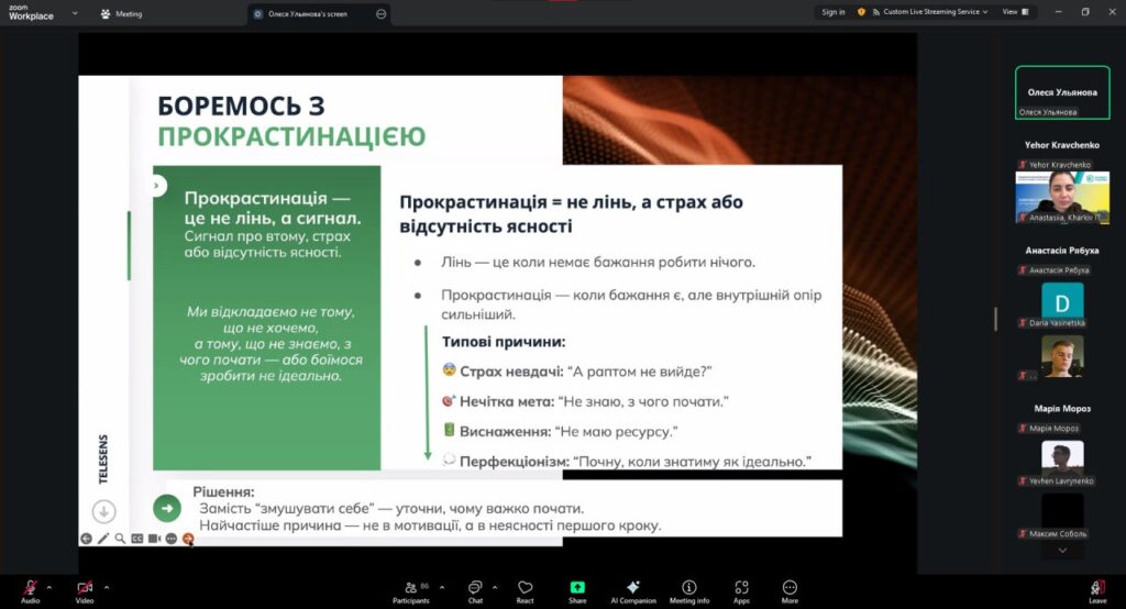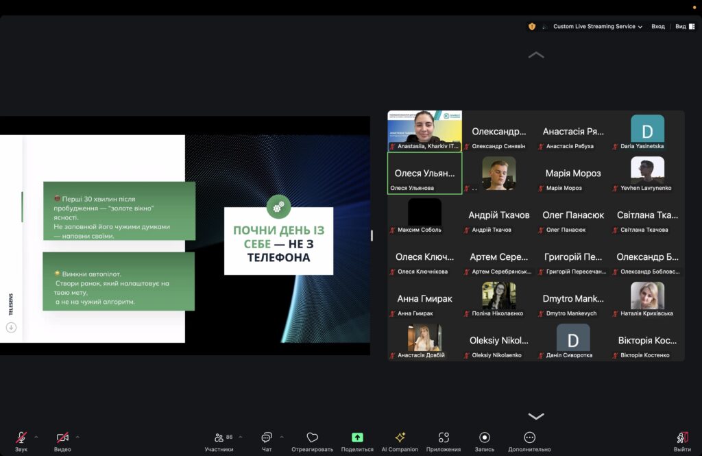 Під час вебінару студенти та викладачі дізналися, як уникати стресу та вигорання, зберігати мотивацію та створювати систему, у якій час працює на них. Особливу увагу було приділено практичним методам тайм-менеджменту, які допомагають жити у власному темпі, залишаючись ефективними та продуктивними.