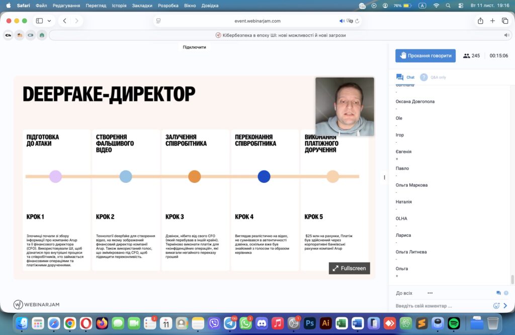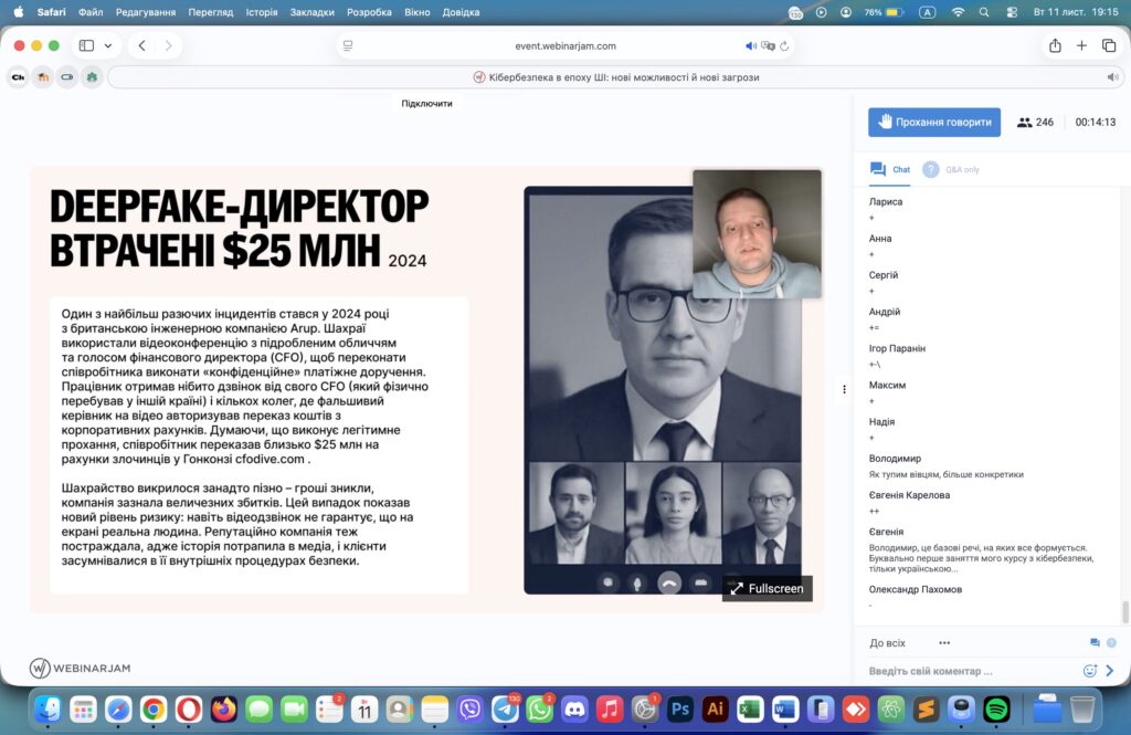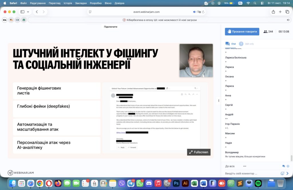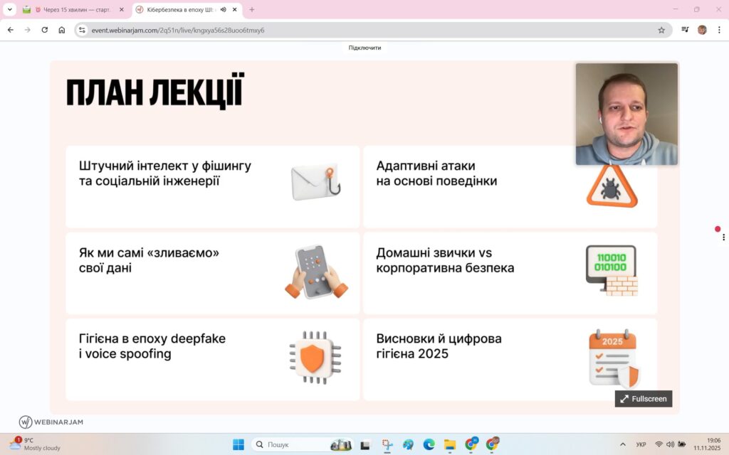 У сучасному цифровому світі штучний інтелект не лише відкриває нові можливості, а й створює нові виклики. Як AI використовують у шахрайських схемах? Як захистити себе від фішингу, підробок особистості та автоматизованих атак? Саме ці питання обговорювали учасники вебінару.
