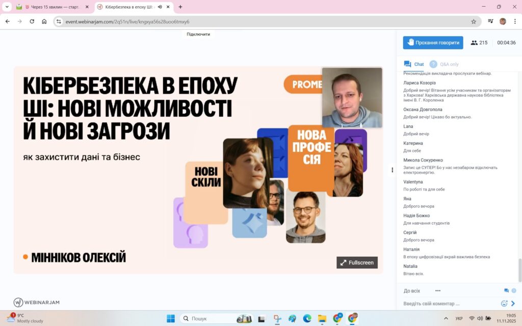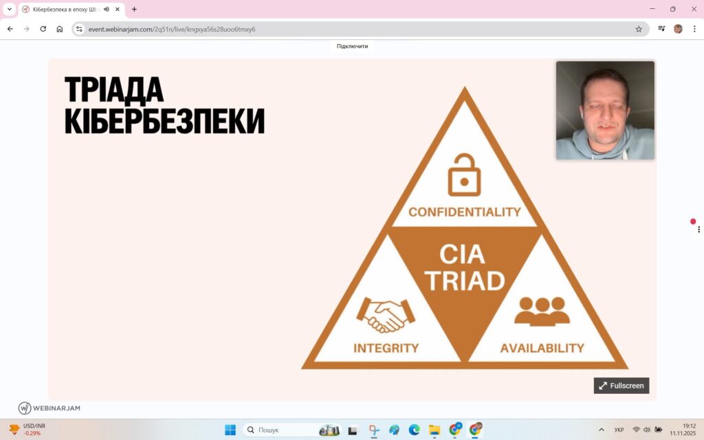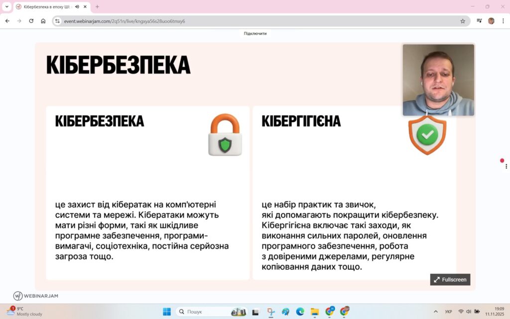 11 листопада 2025 року студенти спеціальностей F3 «Комп’ютерні науки» та F7/123 «Комп’ютерна інженерія» разом із викладачами Надією Божко та Олександром Синявіним долучилися до вебінару «Кібербезпека в епоху ШІ: нові можливості й нові загрози».