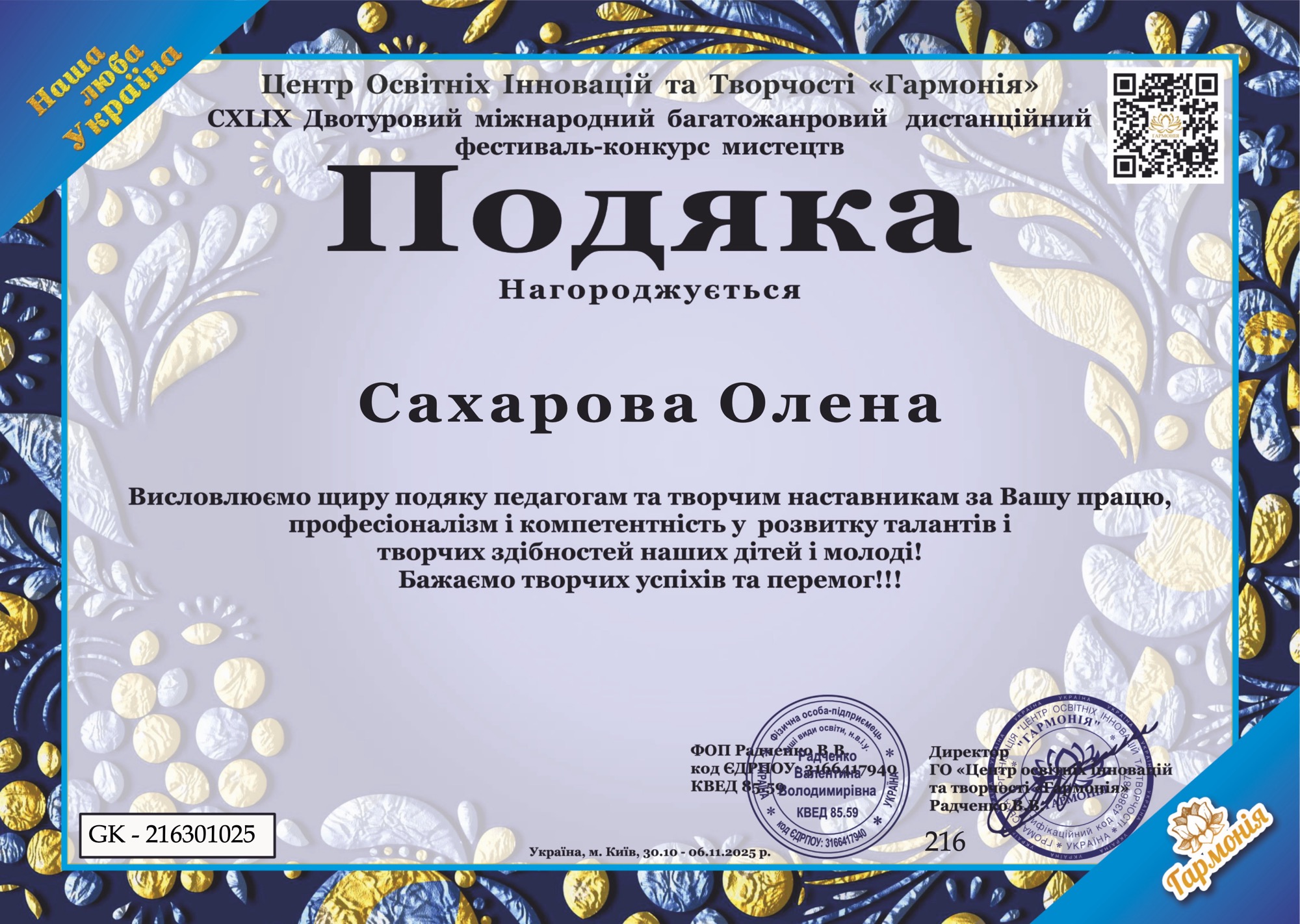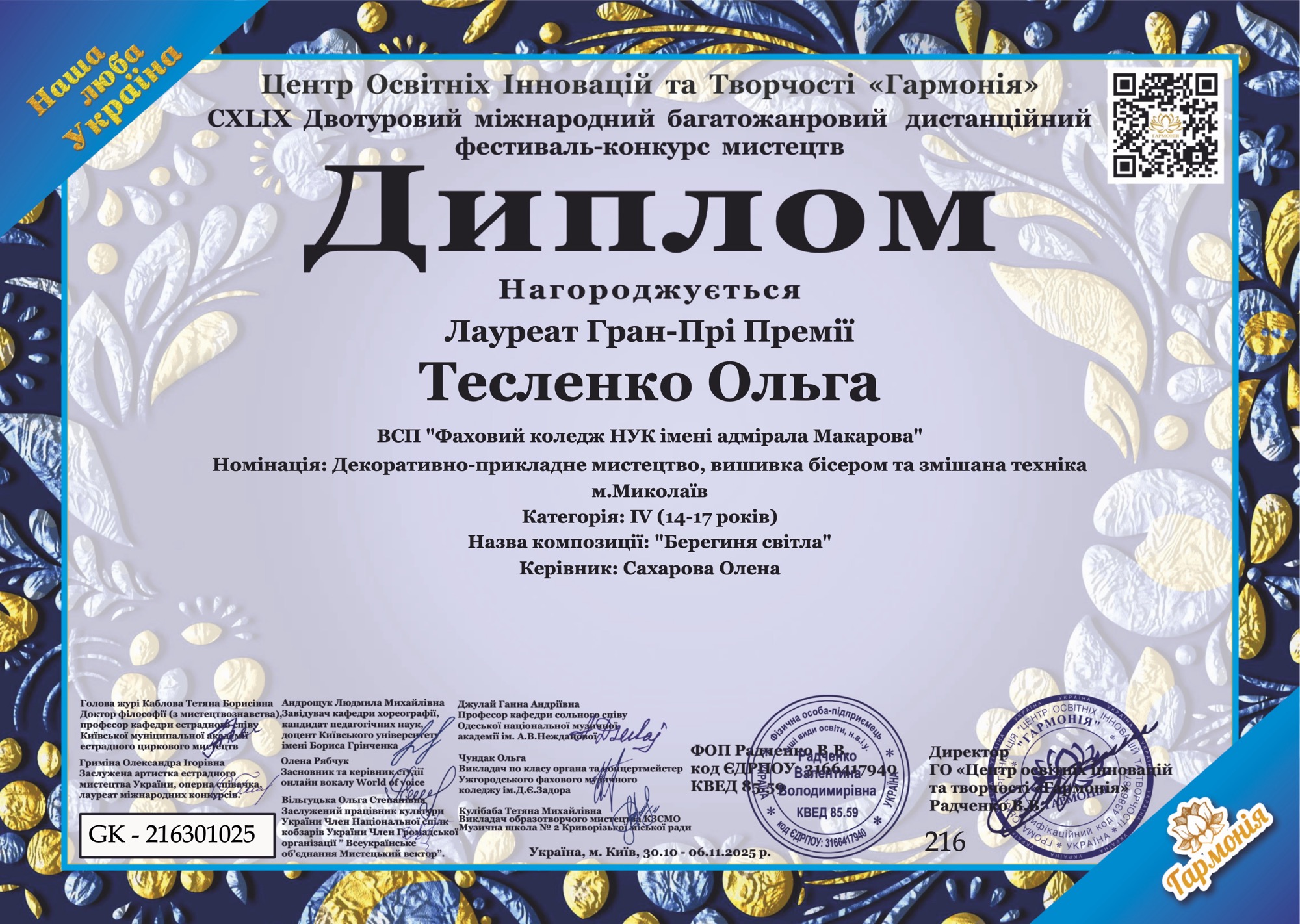🏆За результатами конкурсу Тесленко Ольга здобула Диплом Лауреата Гран-Прі Премії, а її керівник – Сахарова Олена, отримала Подяку за професіоналізм і компетентність у розвитку талантів і творчих здібностей наших дітей і молоді 🏆.