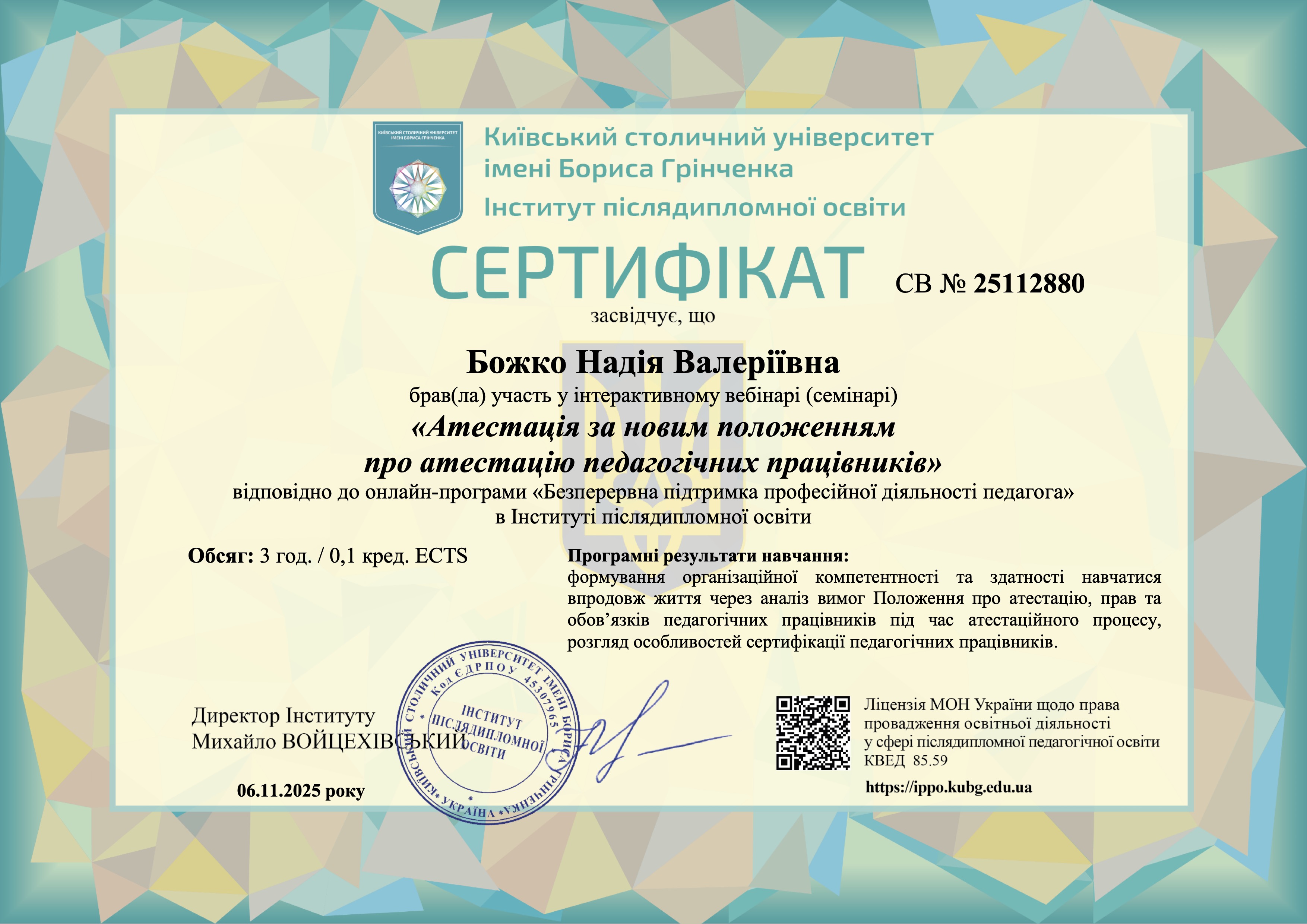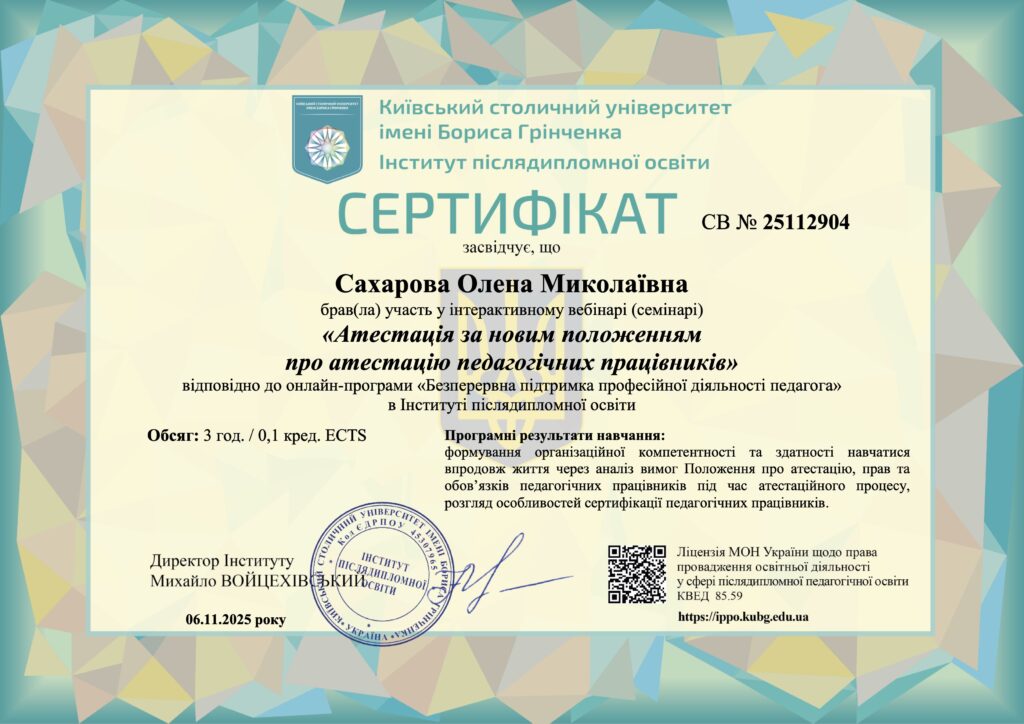 У нашому освітньому закладі постійний професійний розвиток педагогів є одним із пріоритетів. Раді повідомити, що викладачі Сахарова Олена Миколаївна, Божко Надія Валеріївна та Синявін Олександр Миколайович успішно завершили курси підвищення кваліфікації на тему: «Атестація за новим Положенням про атестацію педагогічних працівників».