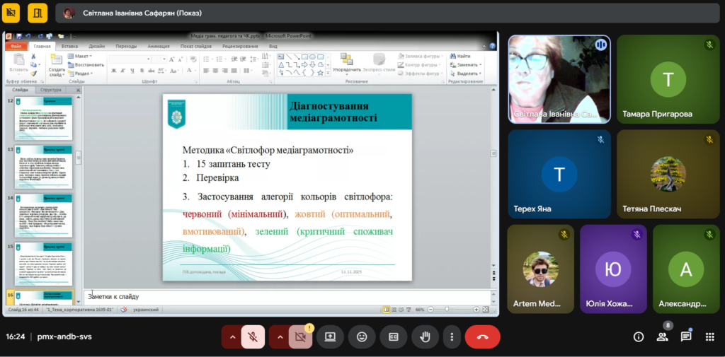 Також було проведено тестування рівня медіаграмотності, що дозволило визначити індивідуальні освітні потреби та вектори подальшого професійного розвитку.