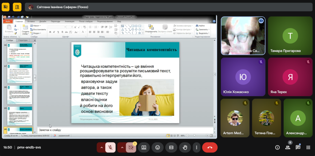Окрема частина вебінару була присвячена читацькій компетентності сучасного цифрового користувача, яка включає вміння ефективно шукати інформацію, оцінювати її якість, працювати зі змістом текстів різних типів і використовувати стратегії смислової обробки даних.