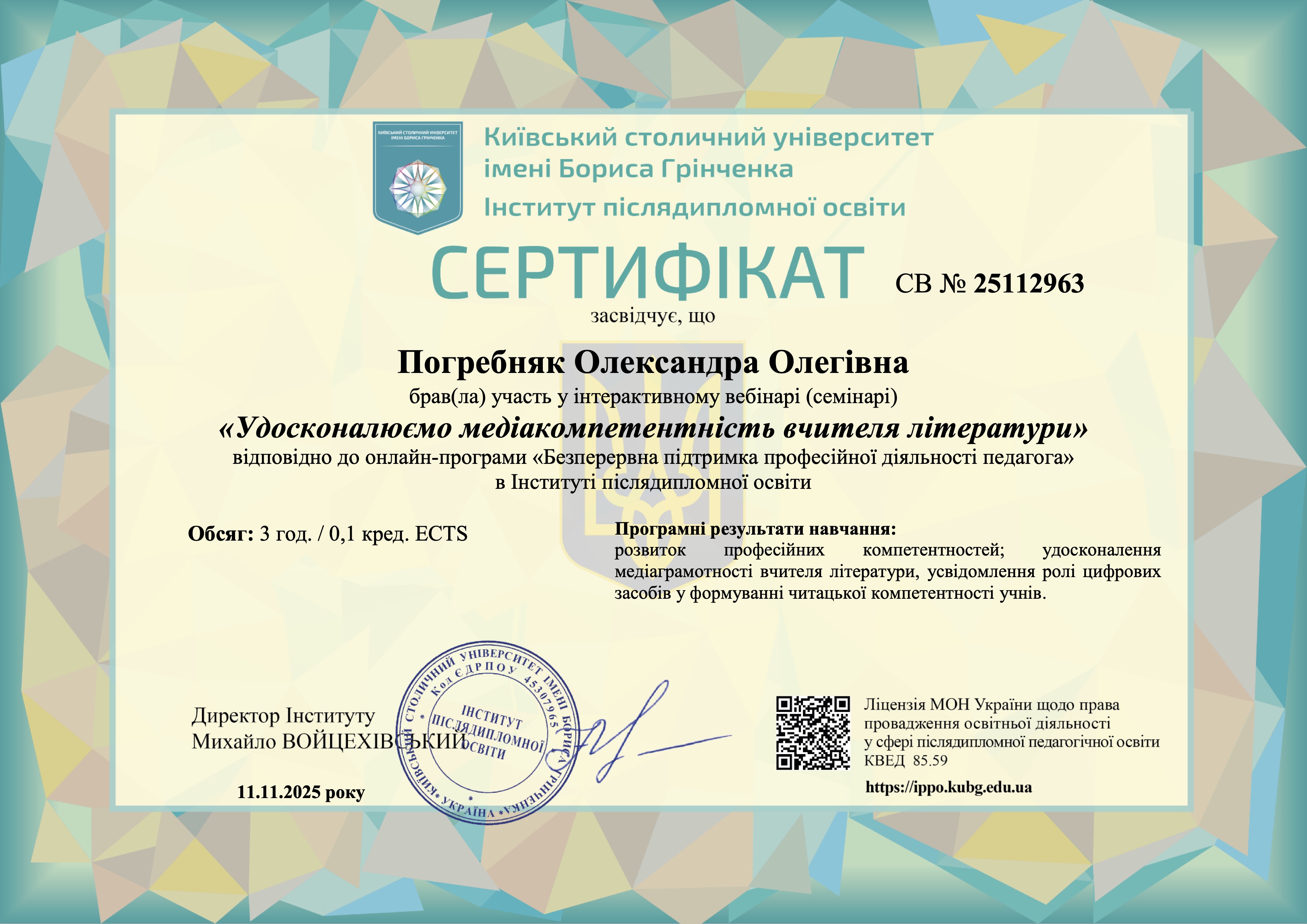 Викладачка української мови і літератури, Погребняк Олександра Олегівна, долучилися до змістовного вебінару «Удосконалюємо медіакомпетентність вчителя літератури», присвяченого розвитку медіаграмотності й критичного мислення в умовах цифрової освіти.