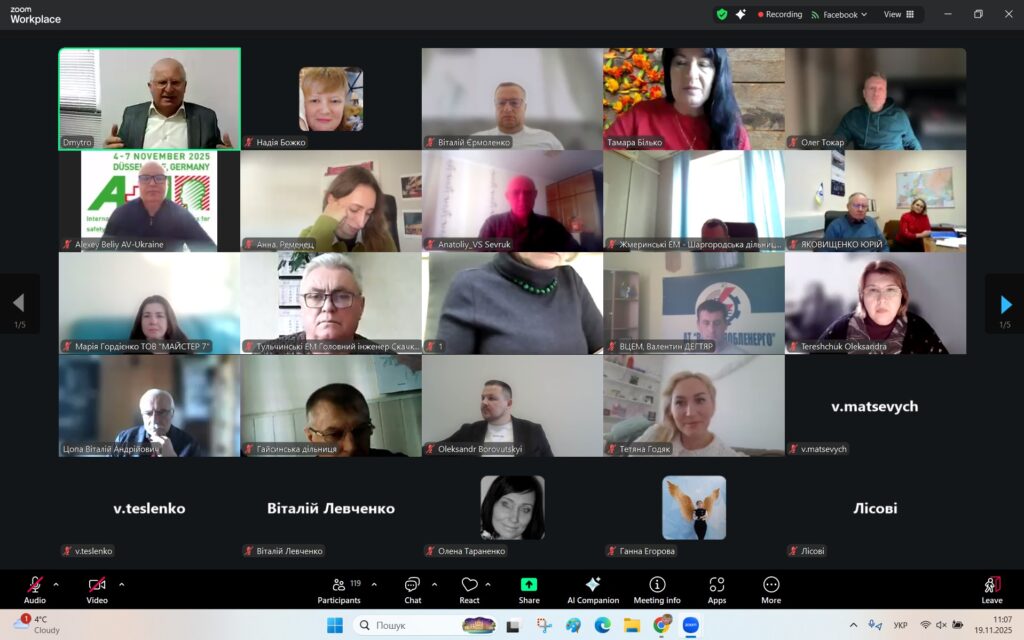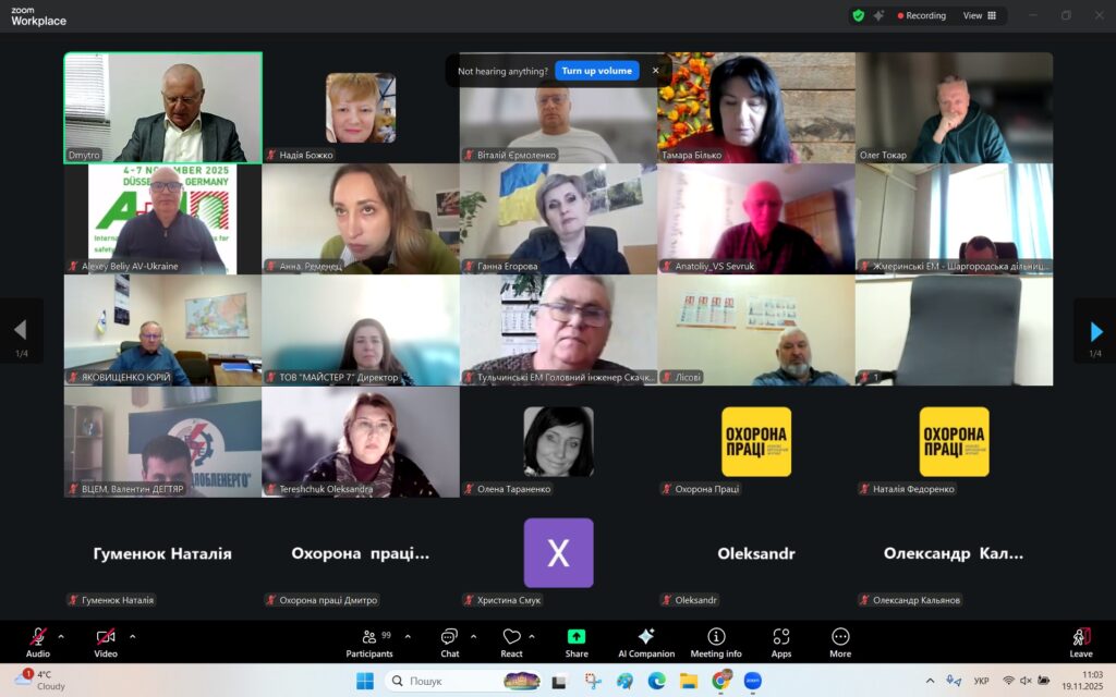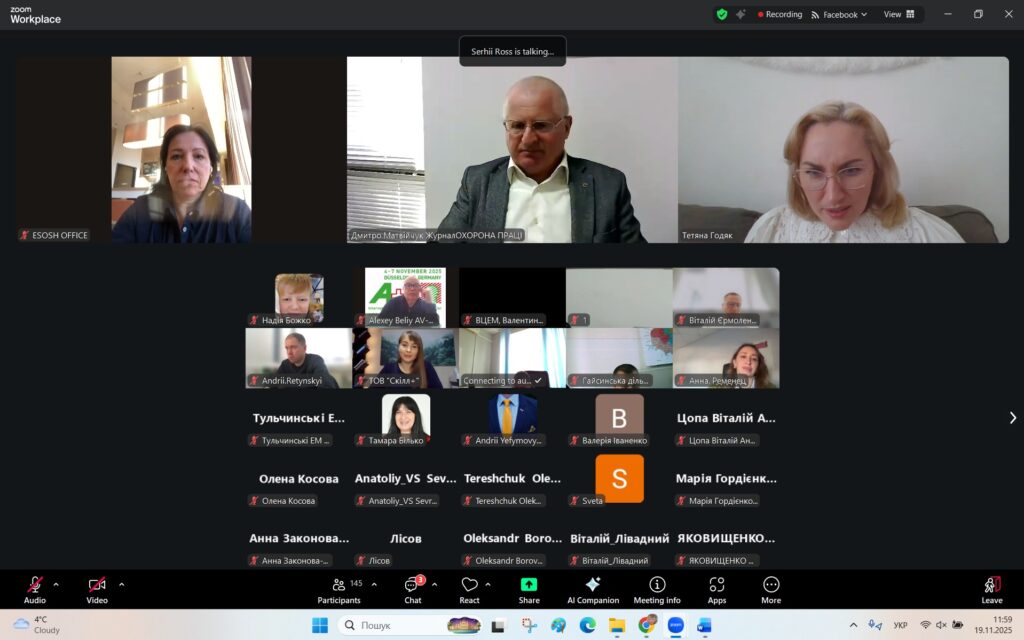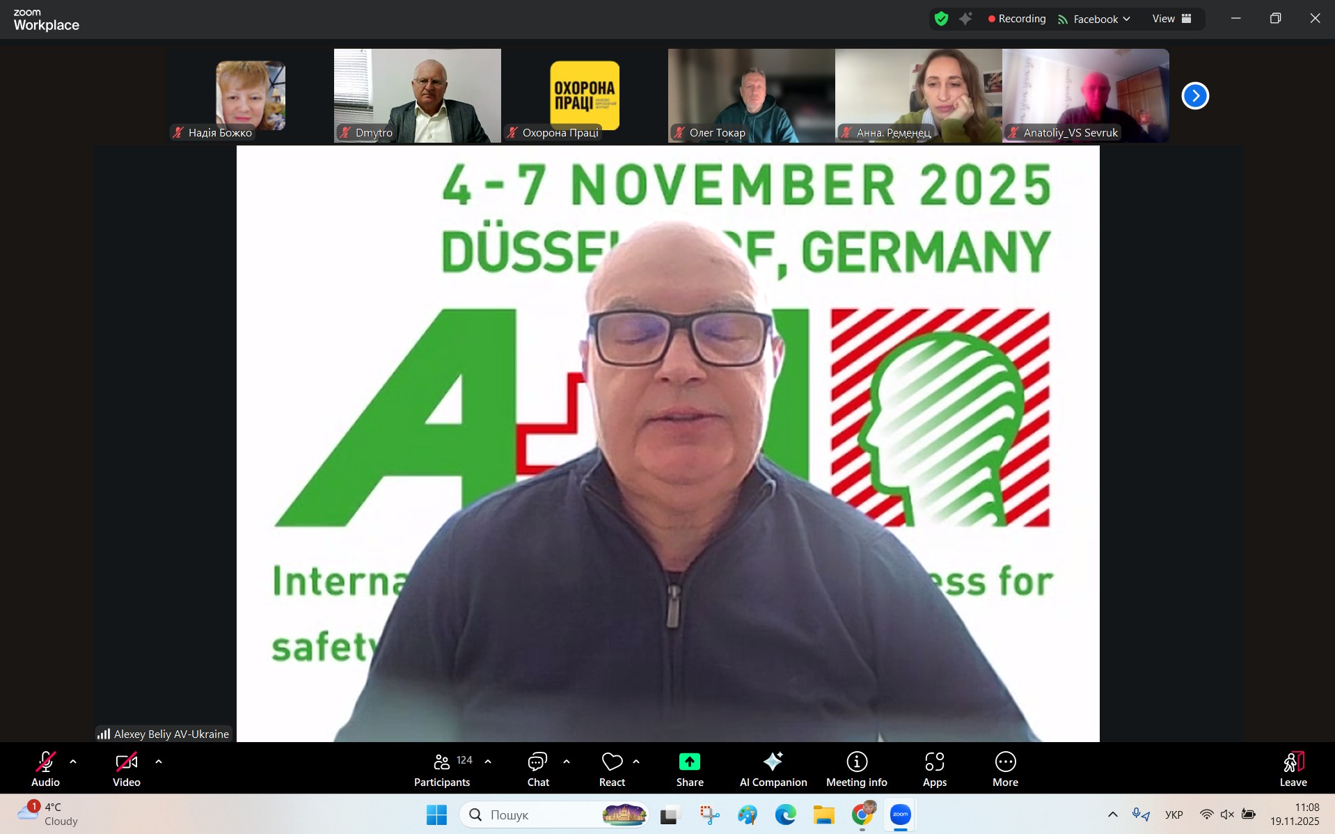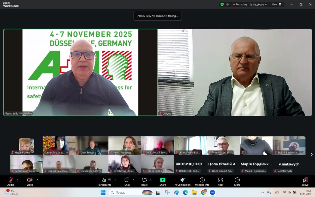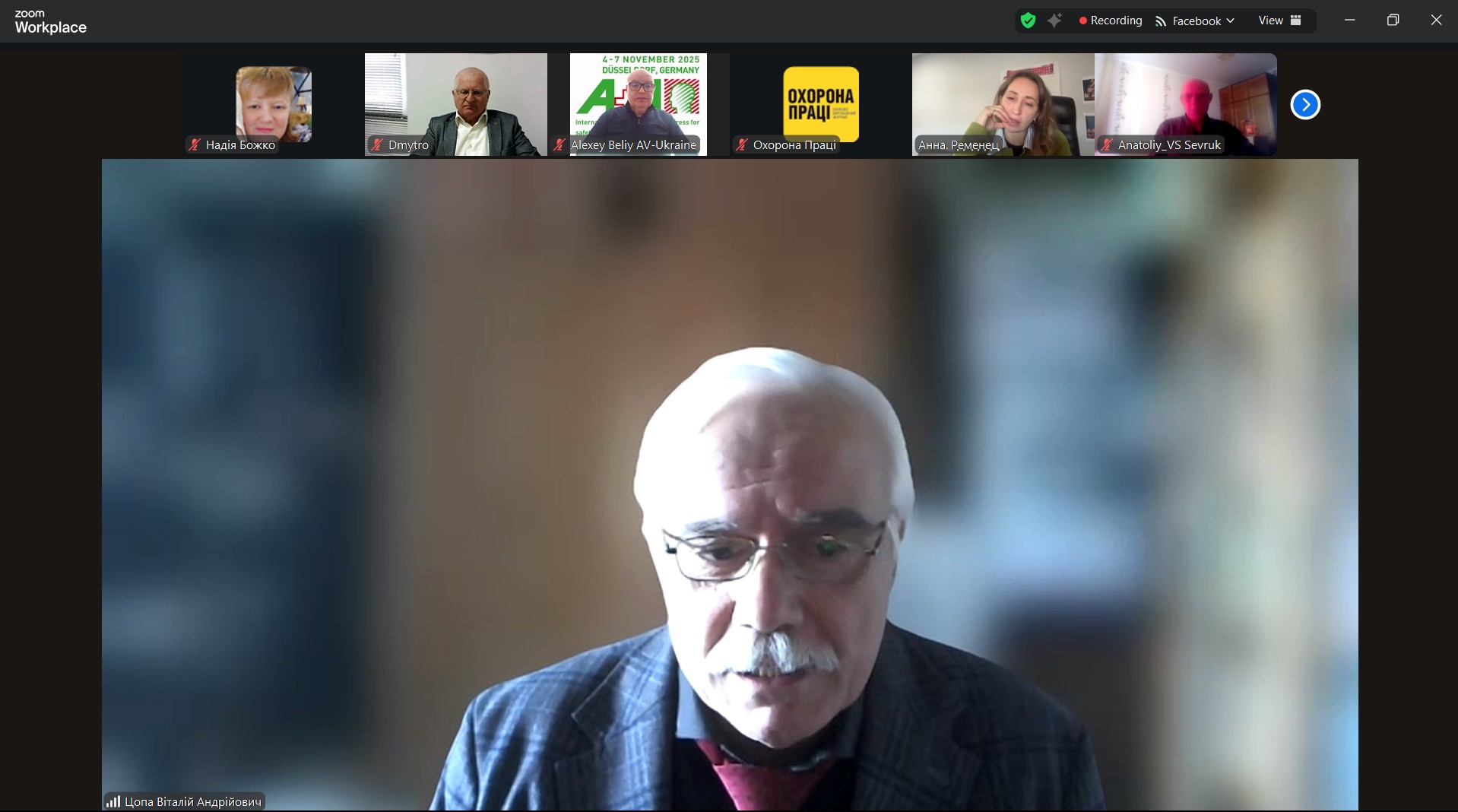 19 листопада 2025 року викладачі Божко Надія Валеріївна та Синявін Олександр Миколайович долучилися до фахового вебінару на тему: «Світові тенденції у сфері безпеки та здоров’я на роботі. Підсумки Міжнародної виставки «А+А» в Дюссельдорфі», організованого редакцією журналу «Охорона праці».