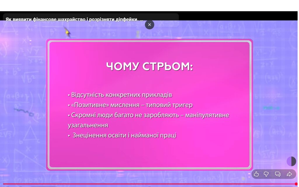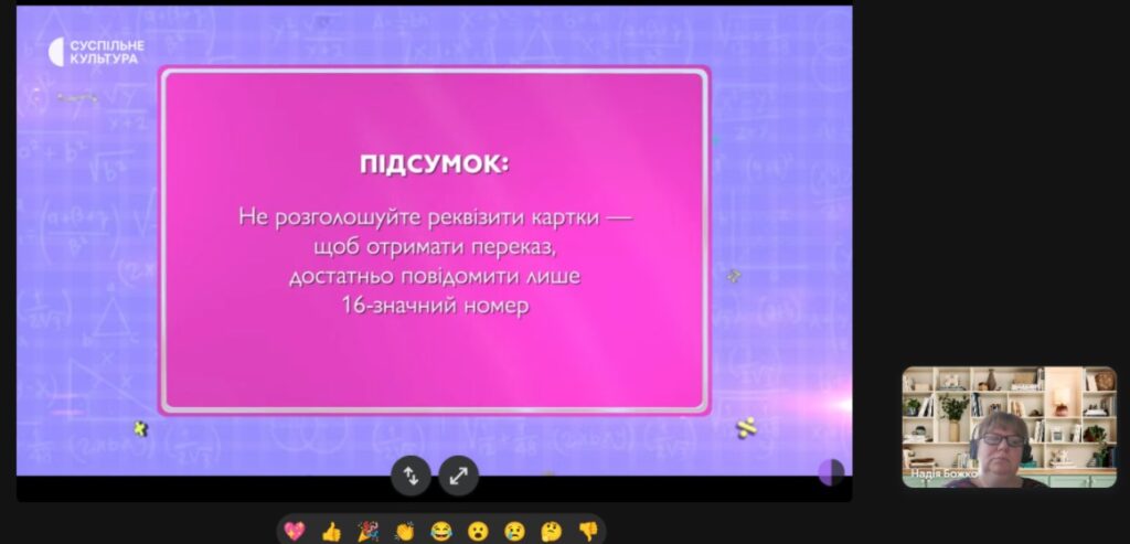 Урок складався з трьох частин: «Життя у соцмережах VS реальність», де йшлося про ідеалізовані образи, «успішний успіх» та приховану рекламу; «Фінансова грамотність», присвячена онлайн-безпеці та розпізнаванню шахрайських схем; та «Штучний інтелект», де учасники дізналися, як розпізнавати діпфейки й навіть побачили створення фейкового відео у прямому ефірі. Отримані рекомендації є надзвичайно важливими для сучасної молоді, яка активно використовує цифрові технології і водночас найчастіше стає мішенню для маніпуляцій та фінансових шахраїв.