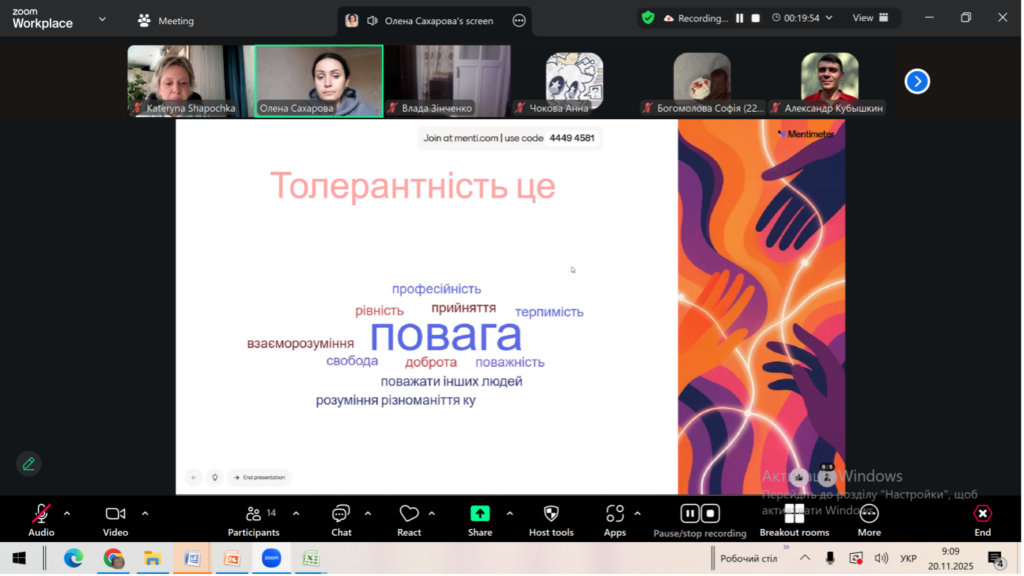 В умовах дистанційного спілкування надзвичайно важливою стала тема цифрової толерантності. Під час спеціального онлайн-заходу студенти 225, 226 та 325 академічних груп та викладачі Катерина Шапочка та Олена Сахарова обговорили такі поняття: базове поняття толерантності та її роль у суспільстві; цифрова толерантність; цифровий нетікет та принципи етики онлайн-спілкування — правила, що допомагають уникати конфліктів і сприяють порозумінню у віртуальному просторі.