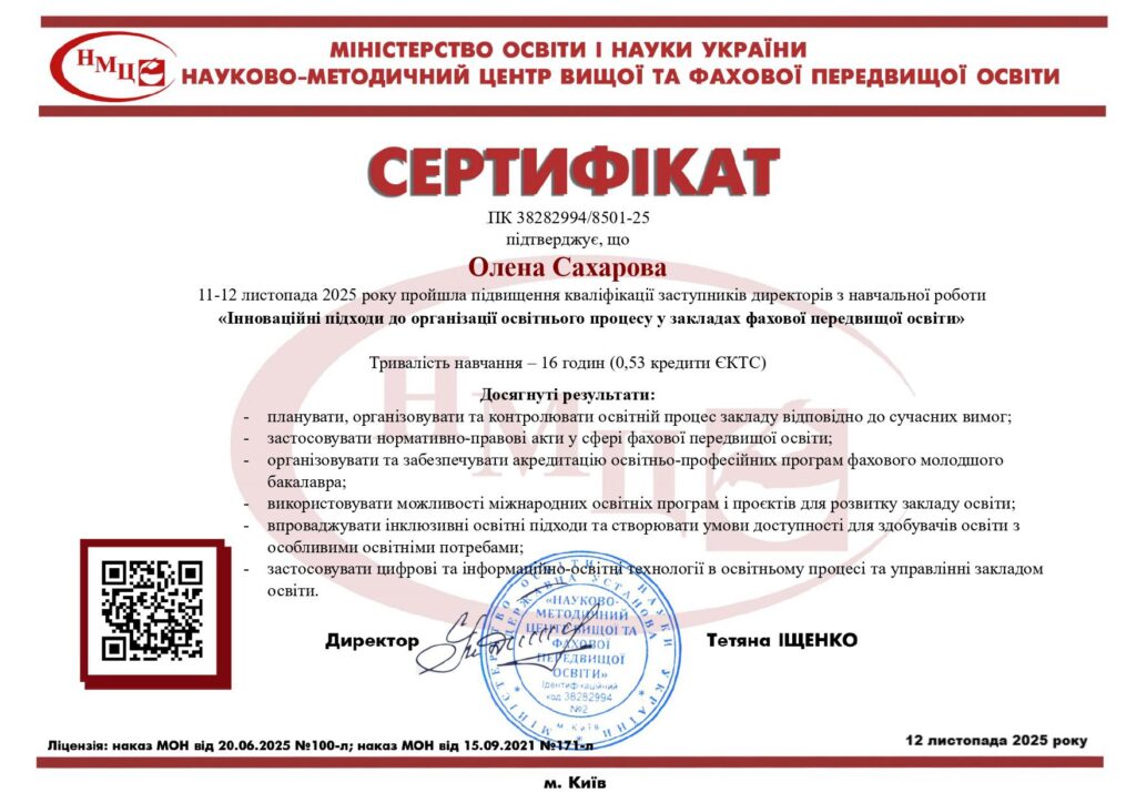 11-12 листопада 2025 року Сахарова Олена Миколаївна, заступник директора з навчально-виховної роботи, пройшла підвищення кваліфікації заступників директорів з навчальної роботи «Інноваційні підходи до організації освітнього процесу у закладах фахової передвищої освіти».