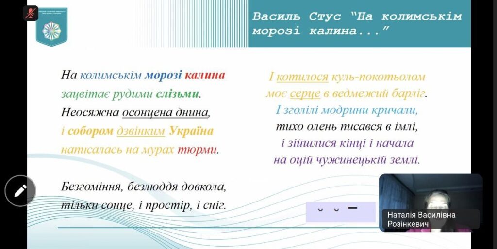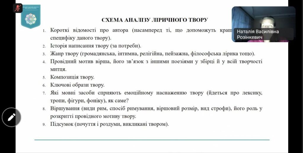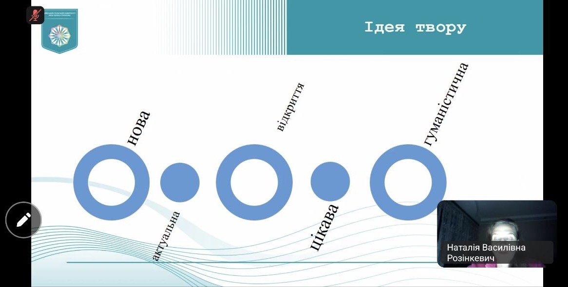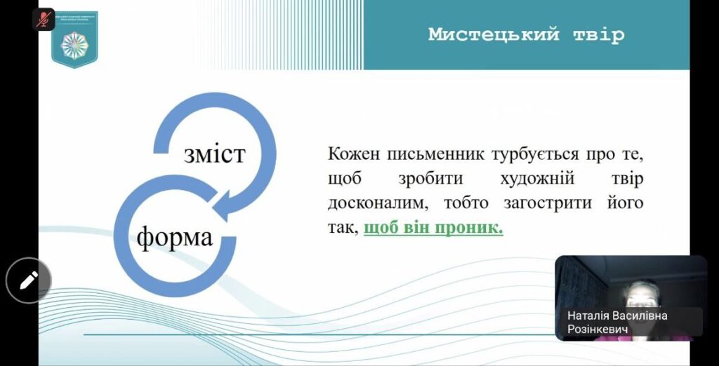 Під час онлайн-зустрічі учасники зосередили увагу на тому, що саме робить мистецький твір цінним, довершеним і впливовим. Було підкреслено, що художність – це не лише технічна майстерність, а насамперед гармонія форми й змісту, продуманий добір художніх засобів, уміння створити образ, який промовляє до читача.