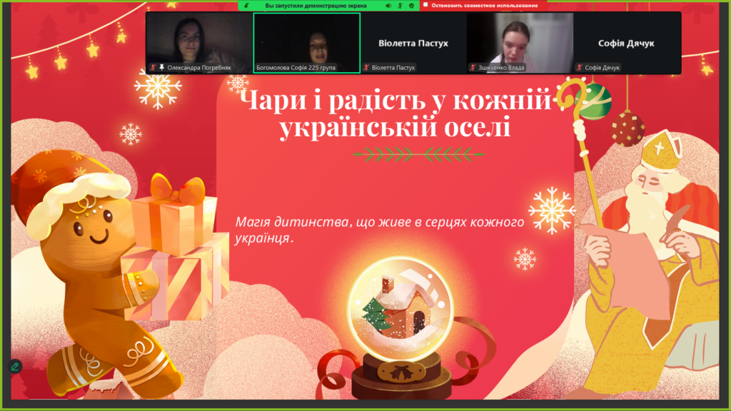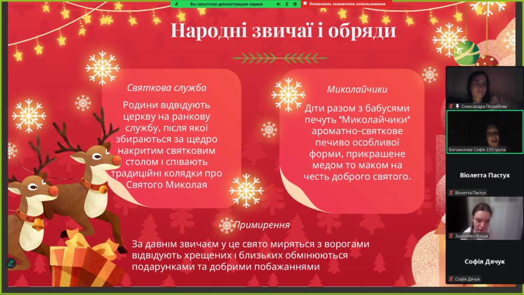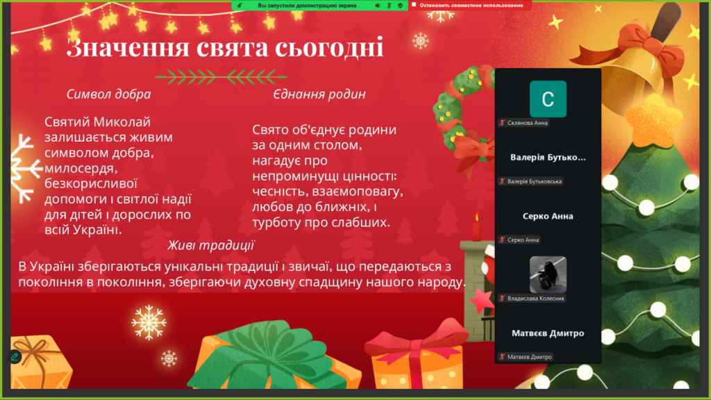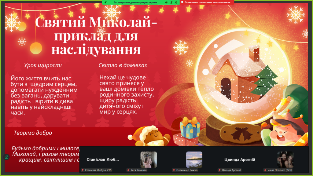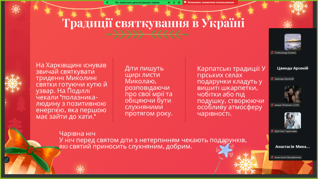 Також учасники ознайомилися з українськими традиціями святкування цього дня: від написання листів Чудотворцю до давніх звичаїв Карпат і Поділля, народних пісень і колядок, зокрема «Ой, хто, хто Миколая любить», «Ішов Миколай лужком бережком», які зберігають дух народної пам’яті й вчать доброти. Їх обговорення допомогло студентам краще усвідомити духовну й культурну значущість свята, а також зрозуміти, чому воно й сьогодні посідає важливе місце в українському суспільстві.