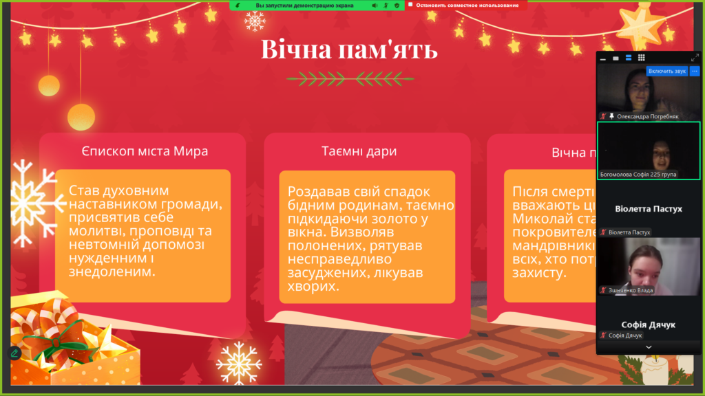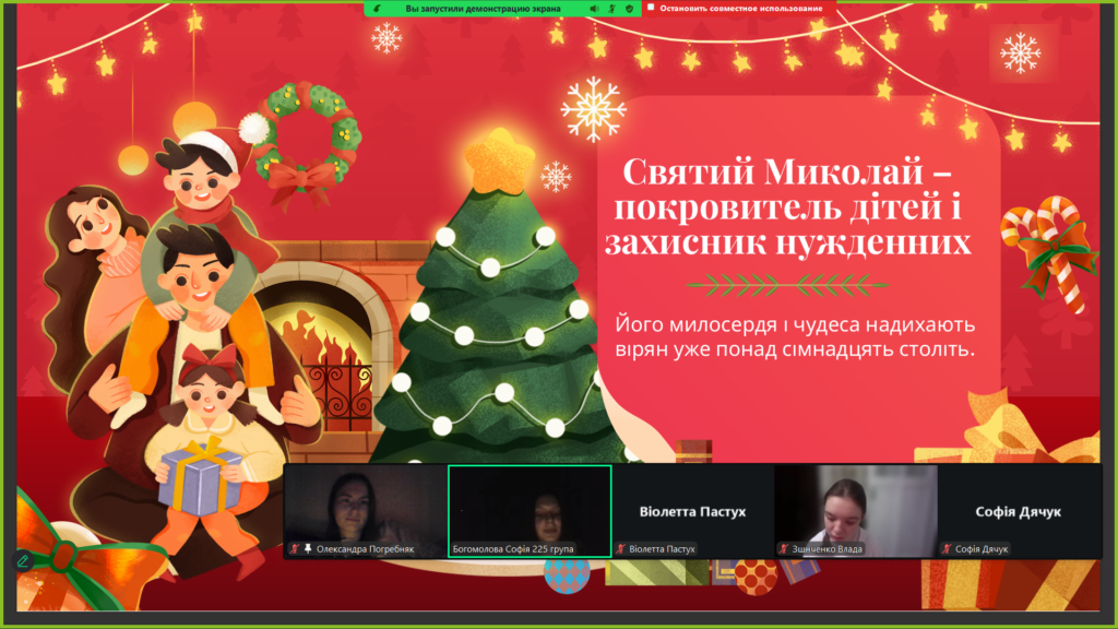 Напередодні одного з найтепліших і найбільш очікуваних зимових свят, Дня Святого Миколая, викладачкою Погребняк Олександрою Олегівною й студентами другого курсу, було проведено тематичний виховний захід, під час якого пригадали історію життя святителя, традиції його вшанування в Україні й обговорили важливість добрих справ і милосердя.