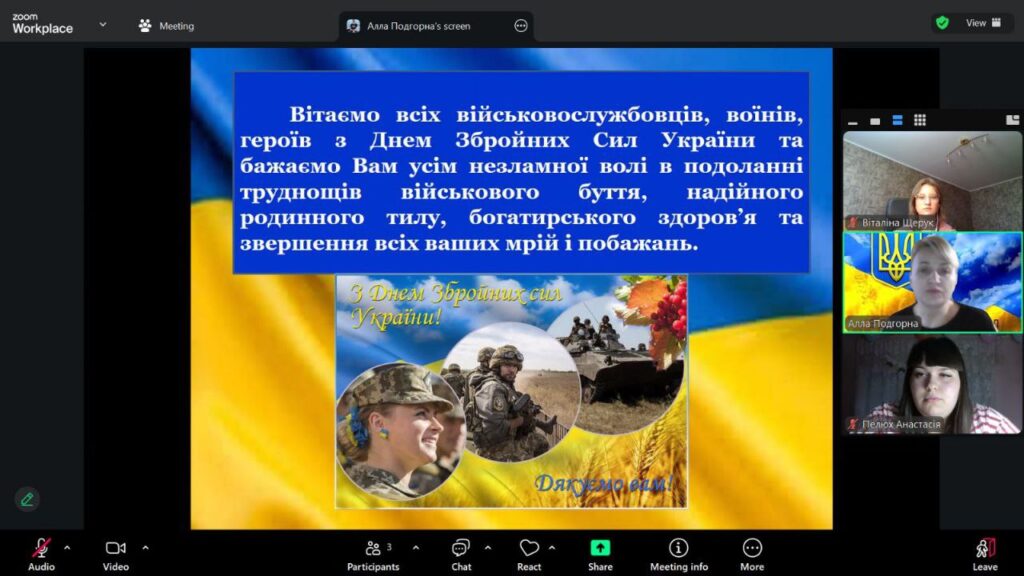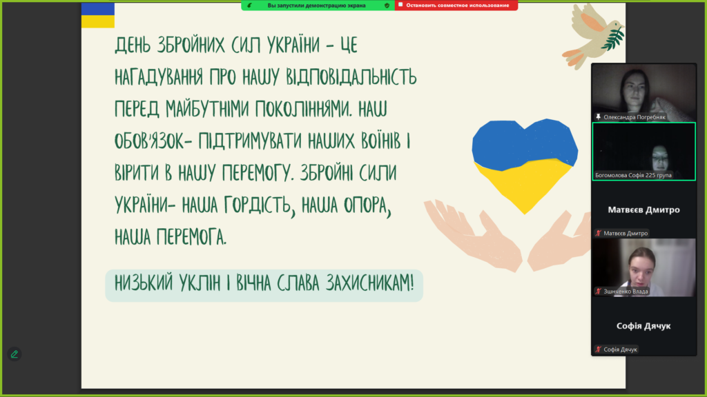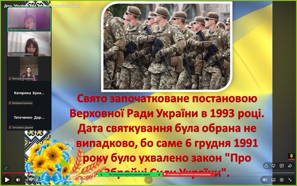 Напередодні Дня Збройних Сил України в нашому закладі було проведено низку виховних годин у онлайн-форматі «6 грудня Свято доблесті та мужності», спрямованих на вшанування українських Захисників та Захисниць.