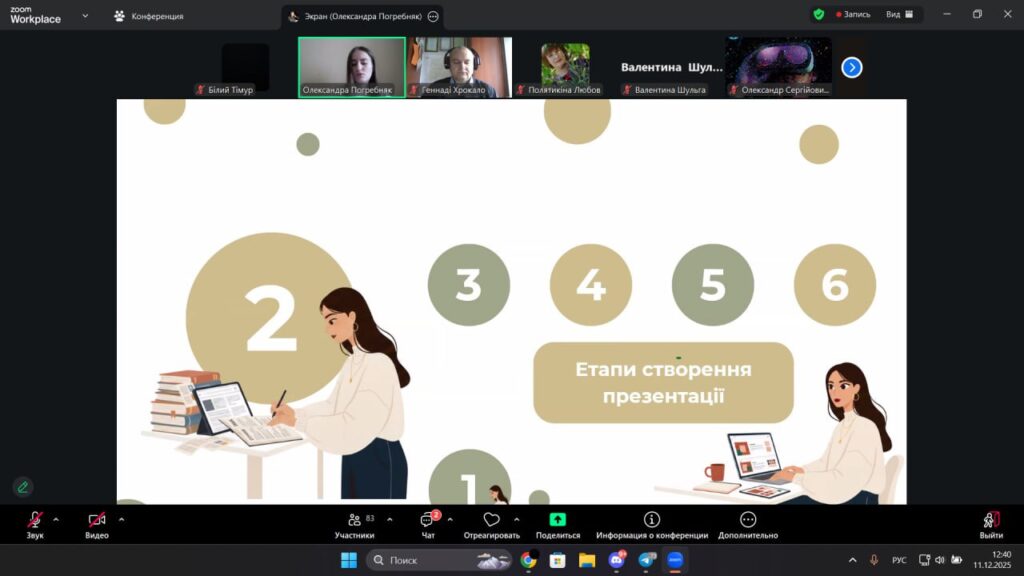 Під час виступу Олександра Олегівна наголосила, що ефективна наукова презентація ґрунтується на поєднанні змістовності, логічної структури та виваженої візуалізації, а цифрові інструменти мають виступати допоміжним засобом, який підсилює ідею дослідження, а не замінює наукове мислення автора.