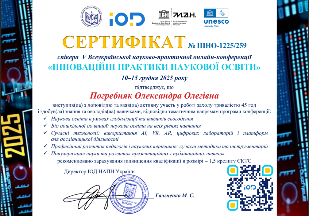 10–15 грудня 2025 року викладачка української мови і літератури, Погребняк Олександра Олегівна, виступила спікером V Всеукраїнської науково-практичної конференції «Інноваційні практики наукової освіти».
