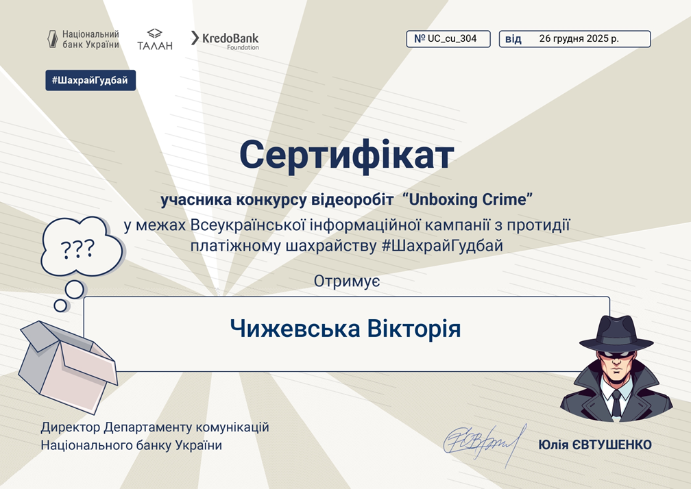 Цьогоріч наші студенти-фінансисти 3 курсу Приймак Дарина та Чижевська Вікторія разом з викладачем Подгорною А. О. взяли активну участь у Всеукраїнському освітньому марафоні «Детективне агентство». Проєкт реалізовано Національним банком України в межах масштабної інформаційної кампанії #ШахрайГудбай.
