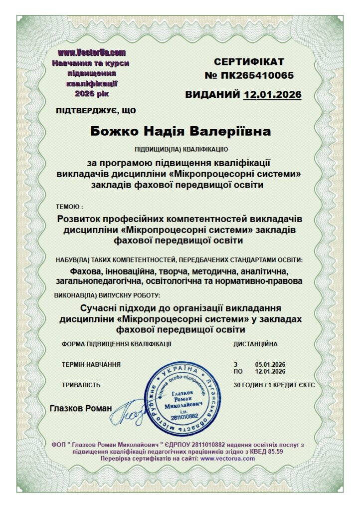 - Божко Надія Валеріївна – з дисципліни «Мікропроцесорні системи»