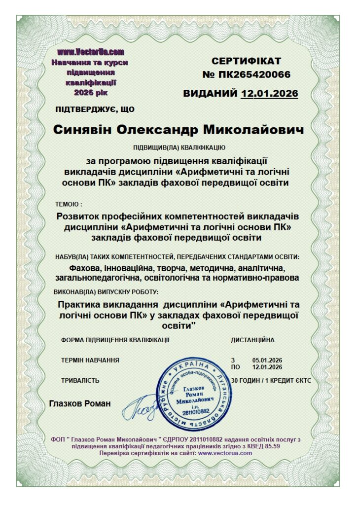З метою підвищення професійної компетентності та впровадження сучасних освітніх підходів у навчальний процес викладачі нашого закладу успішно пройшли курси підвищення кваліфікації на освітньому порталі VECTOR UA у дистанційному форматі.