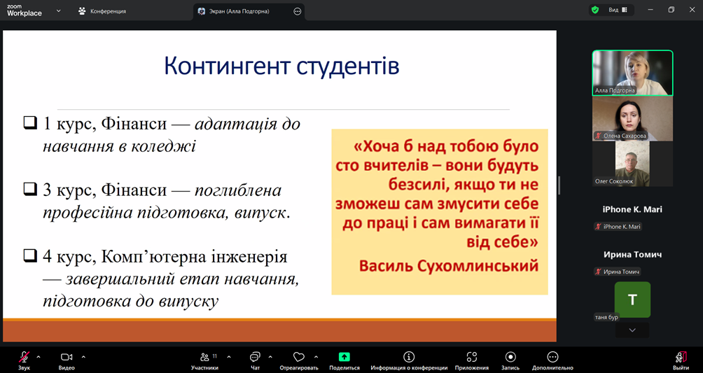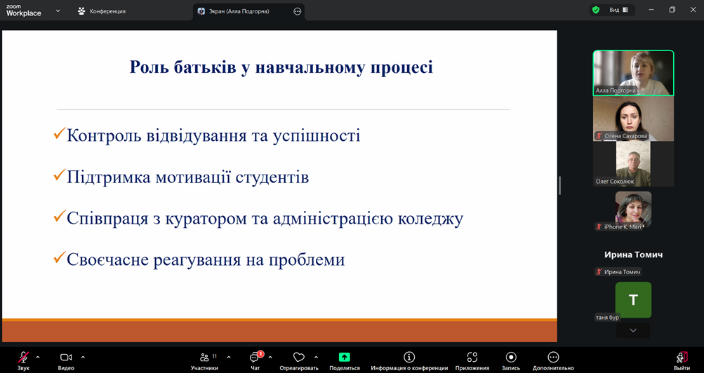 Під час зборів наголошено на важливій ролі батьків у освітньому процесі, зокрема у контролі успішності та відвідування, підтримці мотивації студентів, співпраці з куратором і адміністрацією коледжу та своєчасному реагуванні на можливі труднощі.