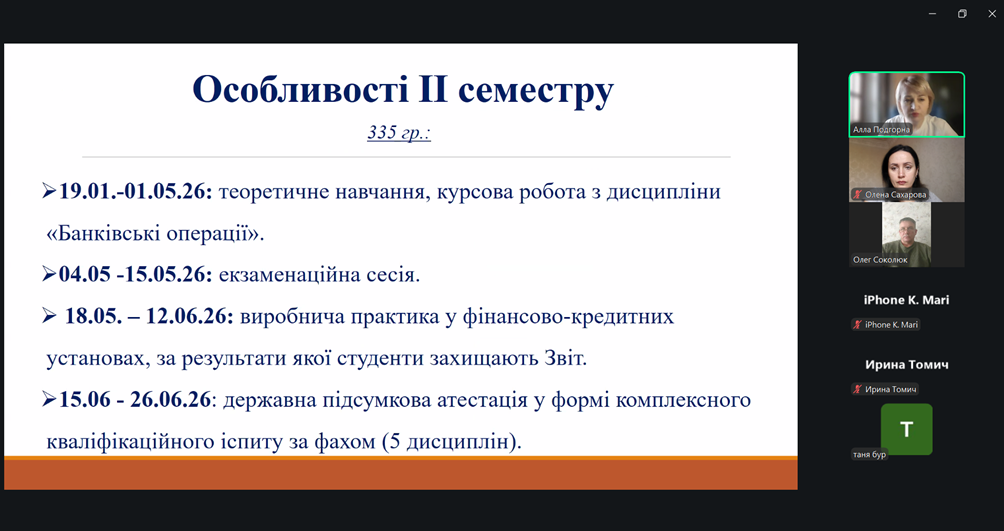 Батьків ознайомили з організацією освітнього процесу у ІІ семестрі, який з 19 січня 2026 року розпочинається у змішаному форматі відповідно до освітніх програм спеціальностей. Було детально розглянуто графіки теоретичного навчання, екзаменаційних сесій, навчальної, виробничої та переддипломної практики, курсових і кваліфікаційних робіт, а також проведення державної підсумкової атестаціїдля випускних груп.