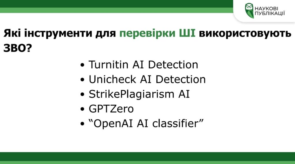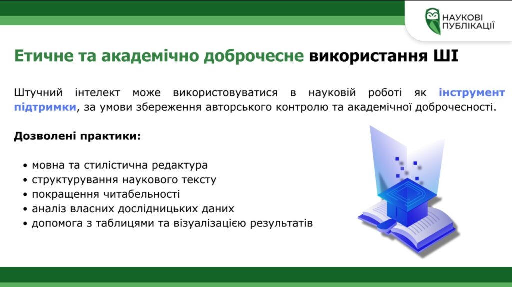 Учасники вебінару дізналися, чому сучасні інструменти виявлення ШІ не є абсолютно надійними та не можуть гарантувати стовідсоткову точність результатів, а також обговорили межі етичного й дозволеного використання ШІ в наукових публікаціях. Окрему увагу було приділено питанням академічної доброчесності, можливим ризикам для авторів та практичним рекомендаціям щодо безпечного й відповідального застосування штучного інтелекту під час роботи над науковими статтями.